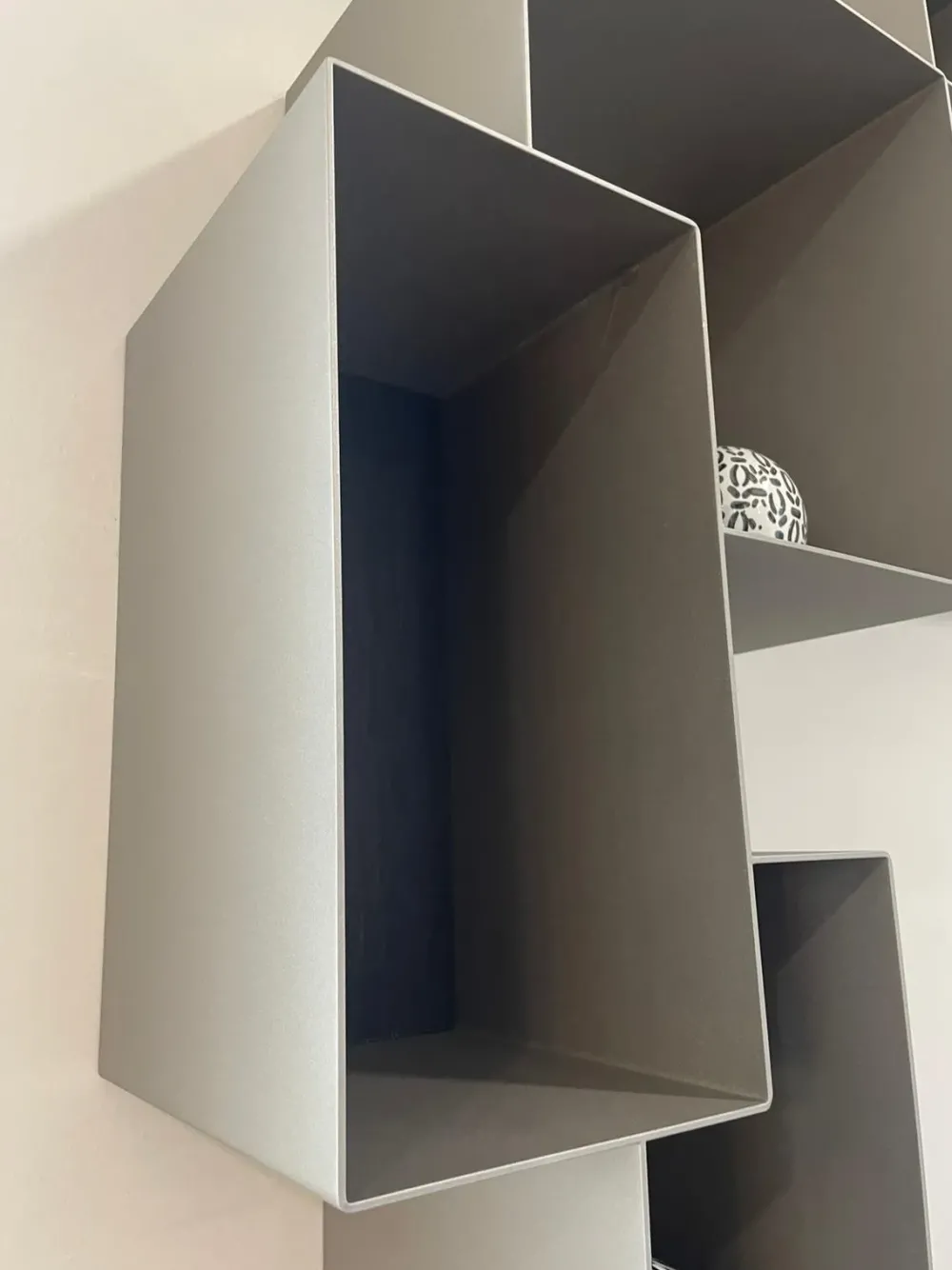 Libreria con struttura in metallo laccata grigio titanio, con schienale in legno finitura rovere carbone