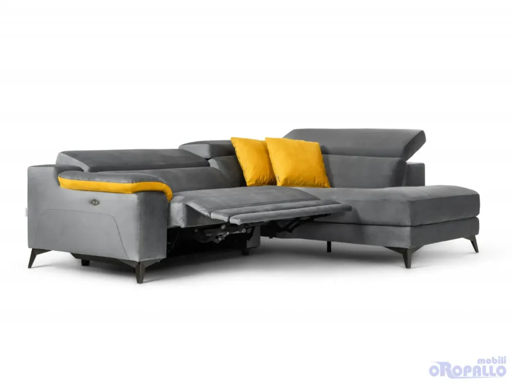 Divano ad angolo in tessuto Cat. C Carabù 77 – inserto Carabù 131. Dotato di poltrona XL con recliner elettrico.