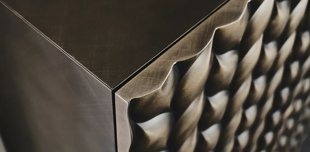 Disponibile con ante Brushed Bronze o Brushed Grey, piedini in acciaio verniciato goffrato graphite (GFM69) o nero (GFM73).