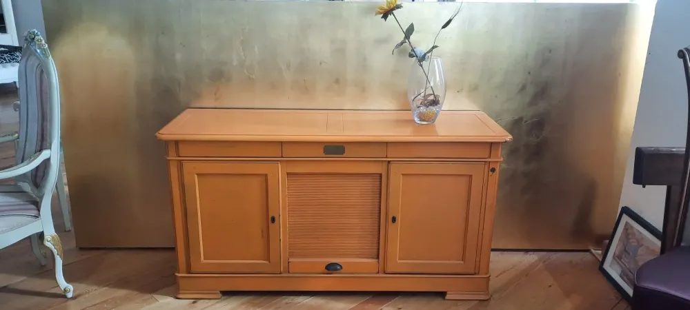 Credenzina Porta TV in legno massiccio 146*48*76 h a 2 ante + serrandina centrale +3 cassetti push-pull+ cassetto segreto nello zoccolo .
