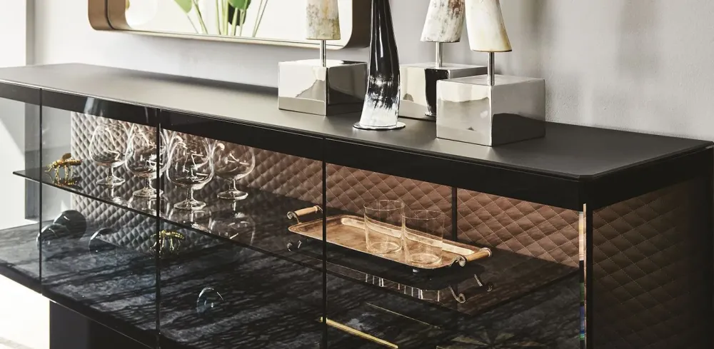 Madia con struttura e piedi in acciaio verniciato goffrato nero (GFM73), ante e fianchi in cristallo fumè con fasce in cristallo verniciato nero. Top e fondo in cristallo verniciato nero acidato, schienale interno in ecopelle o pelle trapuntata come da campionario. Ripiano interno in cristallo fumè. Illuminazione a led inclusa.