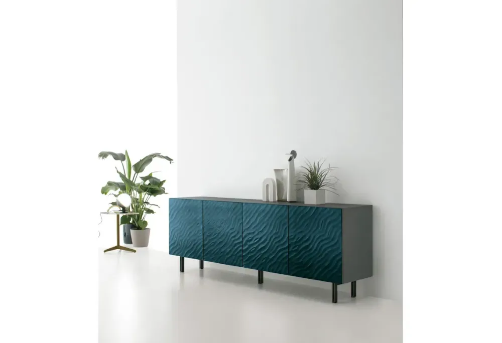 I frontali in vetro di questa madia, disponibili in più varianti cromatiche, creano un elegante superficie increspata che riproduce il delicato movimento della sabbia modellata dal vento.