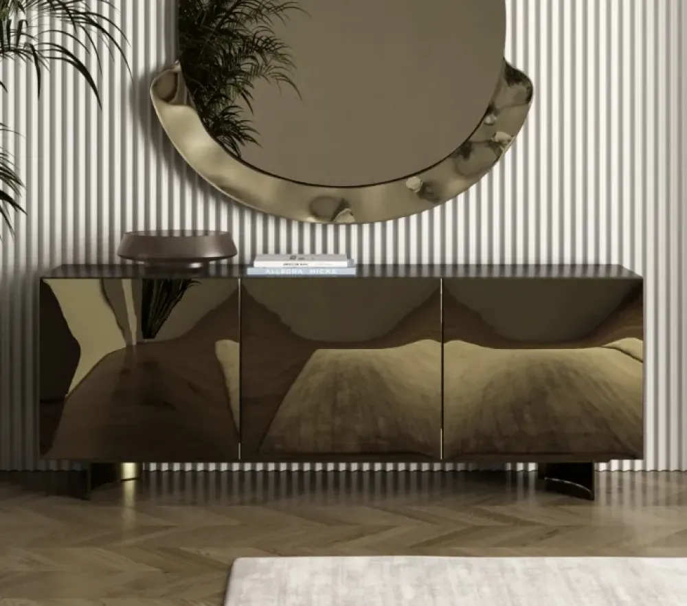 Madia con struttura in legno composta da ante a battente, ripiani interni in cristallo trasparente, fianchi in legno laccato e ante in Specchio Bronzo e Specchio Fumè. A scelta con zoccolo o piede in acciaio.