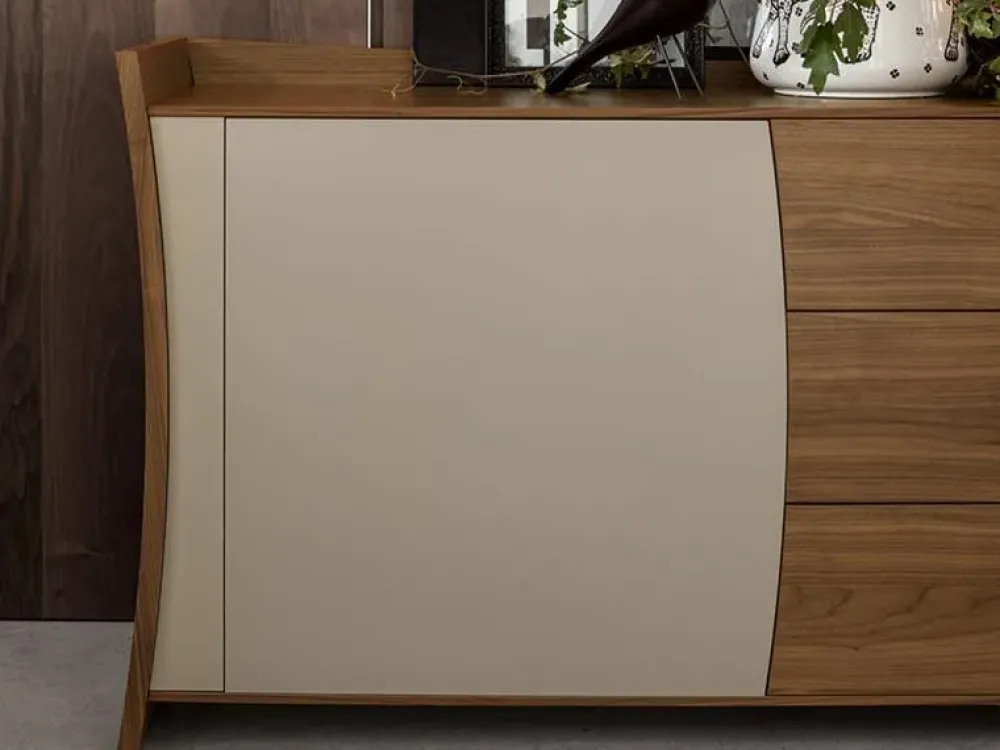 La madia Ermes assottiglia i suoi fianchi e riprende le stesse linee curve nella definizione dei cassetti centrali. La struttura in Noce canaletto si staglia dolcemente oltre il top, incorniciandolo con un’alzatina sagomata. Le ante laccate sabbia mantengono i toni caldi del legno.