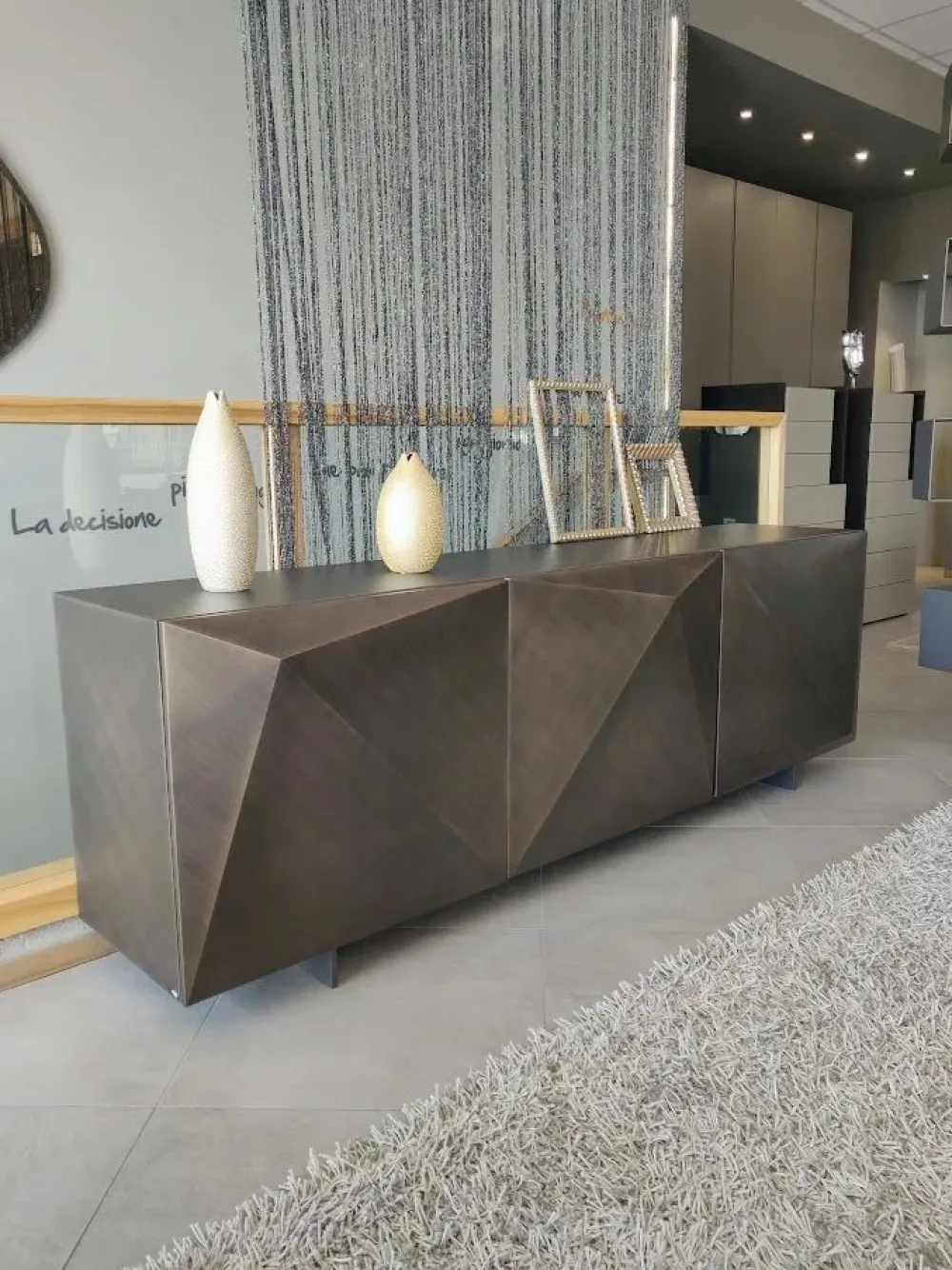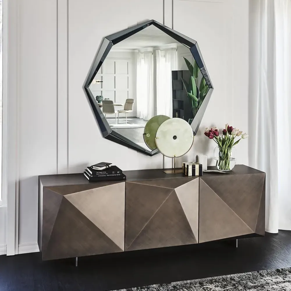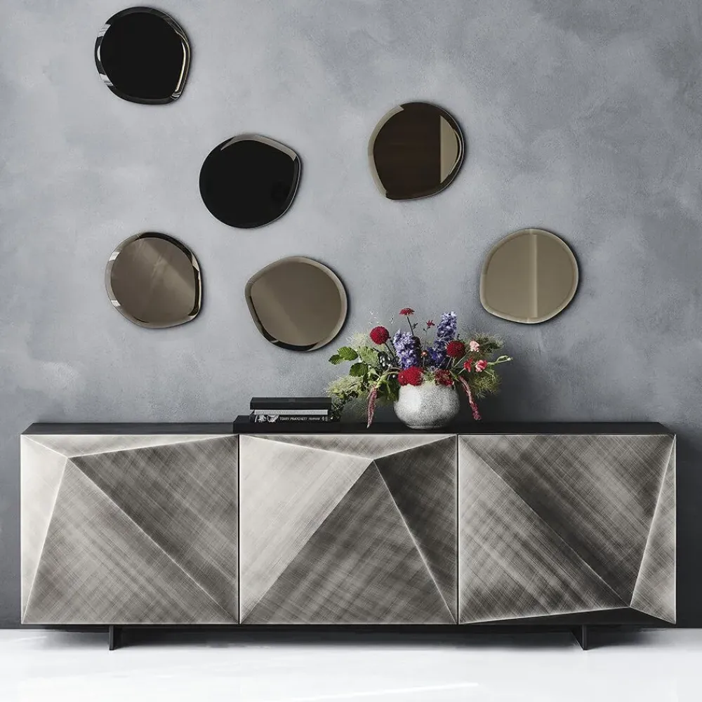 Kayak madia con ante particolare e piedini in verniciati grafite di Cattelan Italia, disegnata dal noto designer Andrea Locatello. La credenza moderna con tre ante diamantate che la rende molto elegante oppure nella versione da due ante per ambienti più razionali.