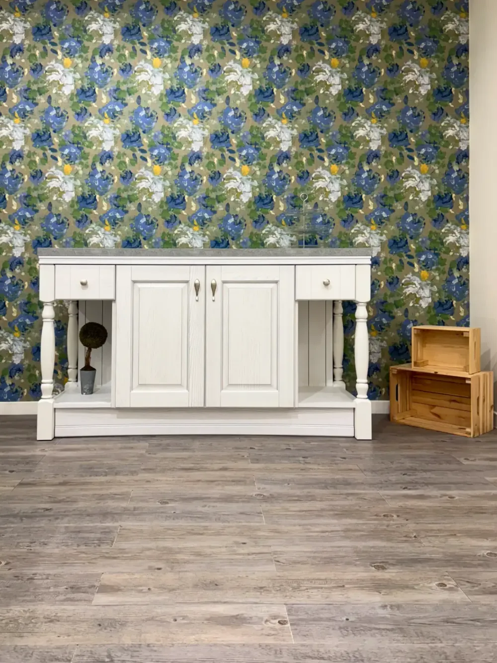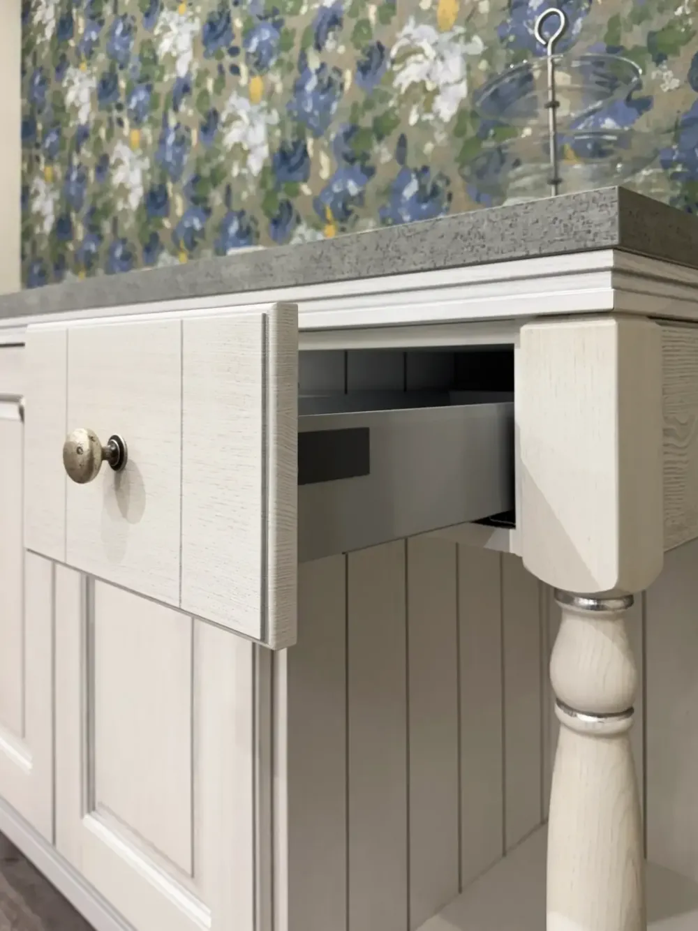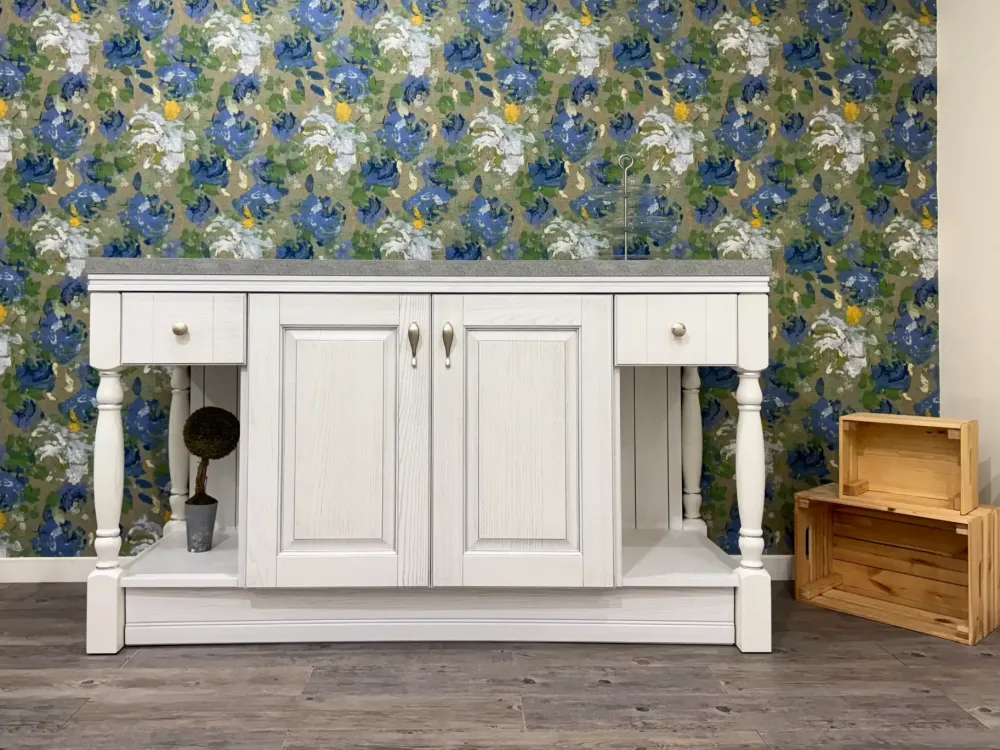 La madia Opera di Colombini casa sa interpretare lo stile del classico provenzale, un eleganza mediterranea raccontata attraverso gli elementi decorativi. Le tonalità del legno gessato definiscono uno stile senza tempo per creare atmosfere country accoglienti ed evocative. la base terminale a giorno con colonnine, diventa una possibile soluzione per sfruttare lo spazio in nome della praticità, ma anche dello stile. Maniglia pomolo goccia, ante in legno naturale bianco.