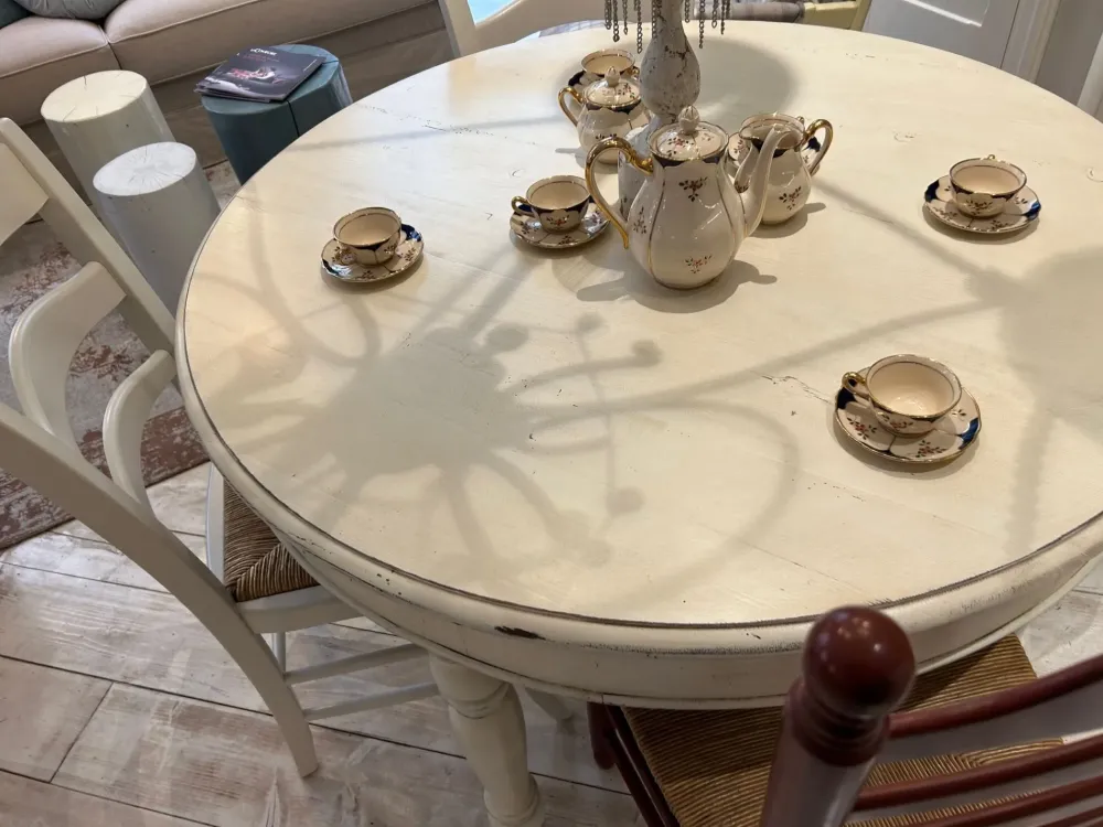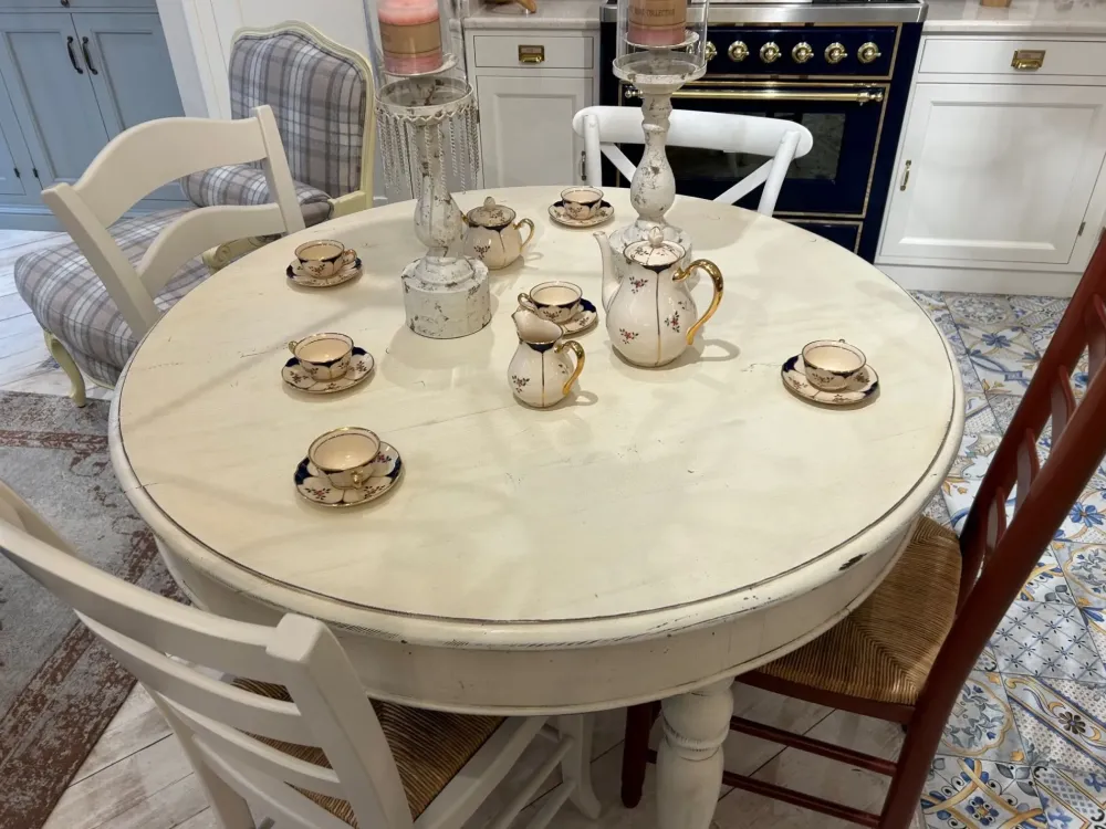 Tavolo rotondo fisso realizzato da Marchi Cucine oin legno vecchio di abete con colore beige e finitura anticata country chic