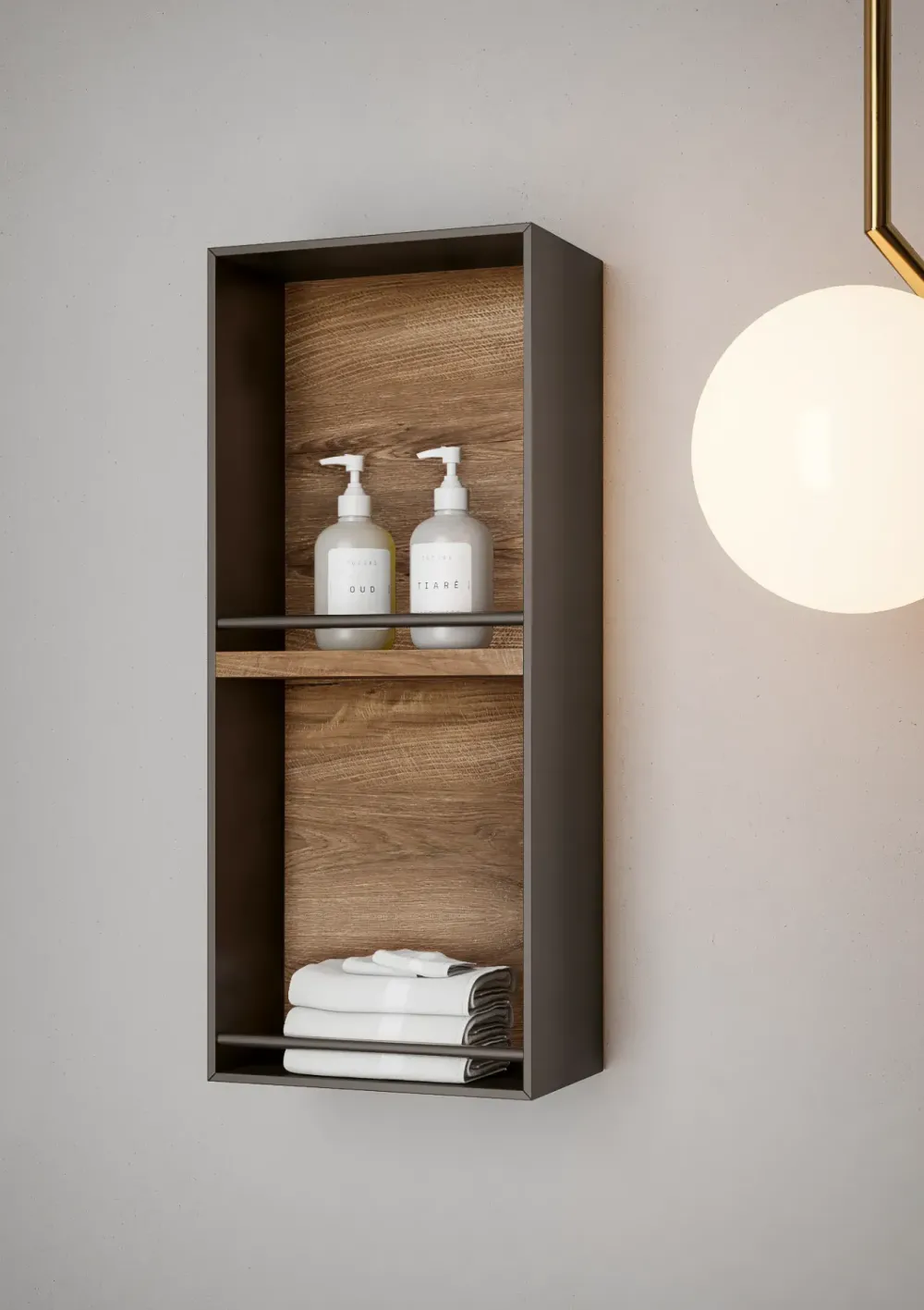 Il monoblocco รจ rifinito in Quercia Wild, una particolare sfumatura che si abbina alla mensola dello specchio mod.Mio, la stessa finitura scelta per il fondale del mobile pensile a giorno che presenta una struttura metallica color Moka. Il contrasto tra i toni caldi del legno si fa ricercato e moderno grazie alla finitura Lava del lavabo.
