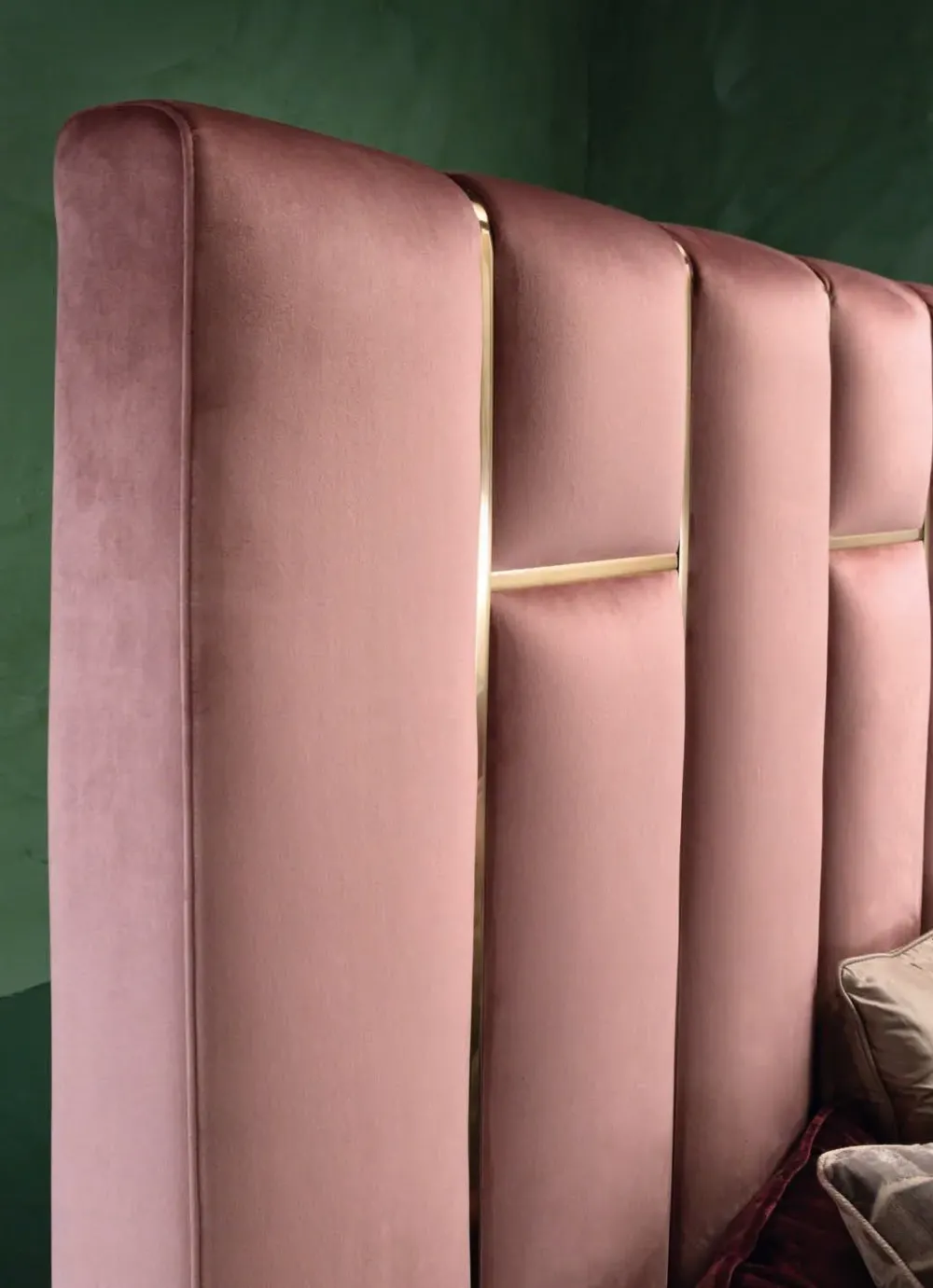 CASTONATI NEL TESSUTO E FISSATI NELLA FUSTO INTERNO CI SONO DEI PROFILI IN ACCIAIO FINITURA ORO , IL RIVESTIMENTO è IN VELLUTO SPESSORATO ROSA ANTICO, DISPONIBILE ANCHE IN DIVERSI COLORI