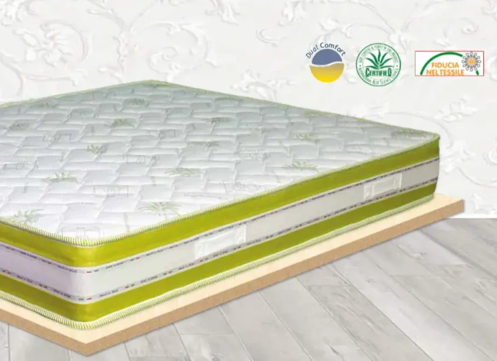 Materasso Matrimoniale da cm 160×190 oppure x 200 altezza 25 cm c.a., rivestimento materasso in Lino , oppure rivestimento in aloe bordato, interno poliuretano espanso in soia da kg 64 , lastra di memory foam altezza cm 5 , 2 cm di cocco per la circolazione sanguinea, molle insacchettate indipendenti, 7 zone differenziate , anti-acaro, indeformabile , ortopedico. altre misure disponibili , fino a fine scorte. Materasso con Garanzia 2 anni 4 Totale 6 anni.