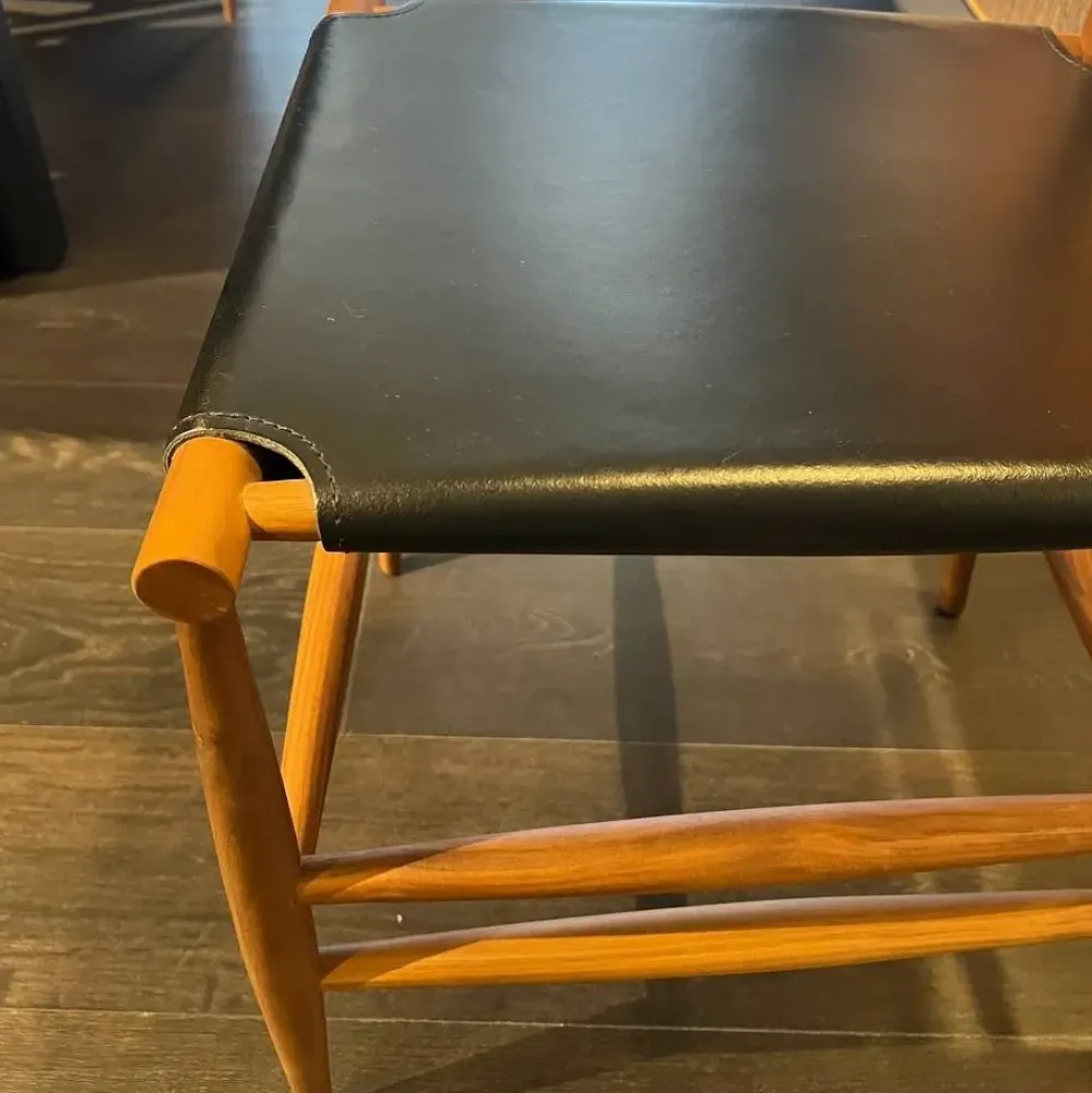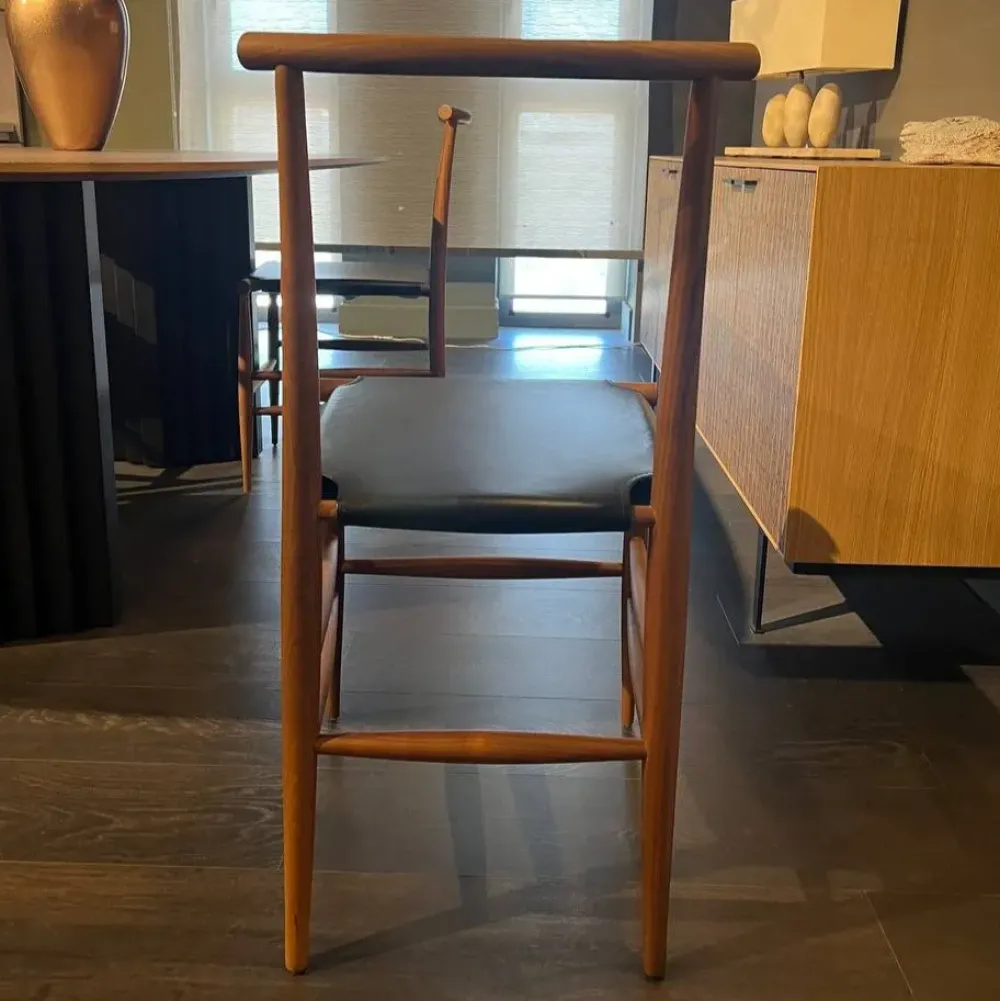 Seduta in cuoio teso a cinghie col. nero e struttura in legno noce canaletto.