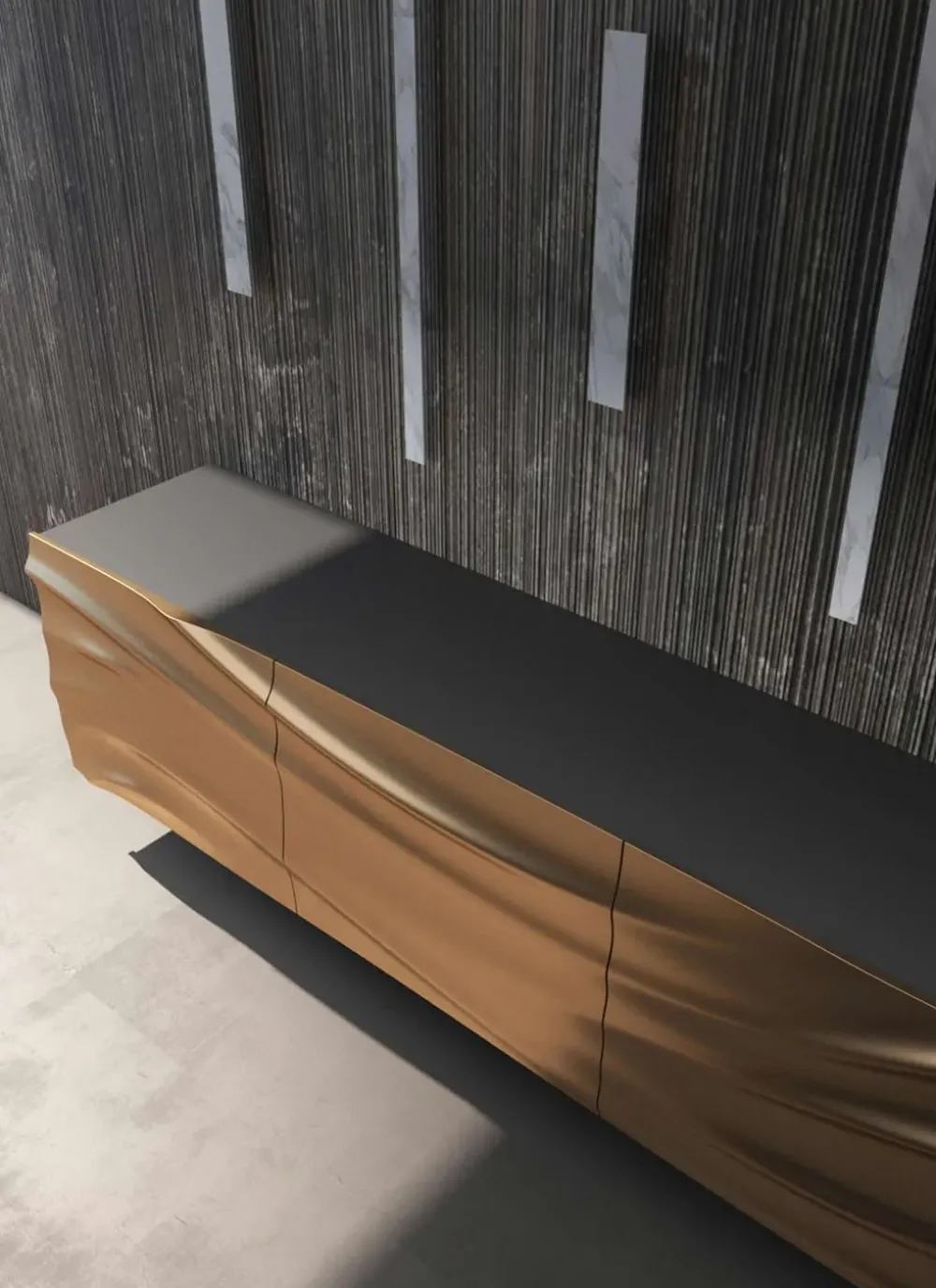 Anta: laccato opaco Bronzo 090 – Struttura: laccato opaco Ardesia 076 – Piede: acciaio sagomato H 18 cm Cm. L 210 P 48 H 73 cm