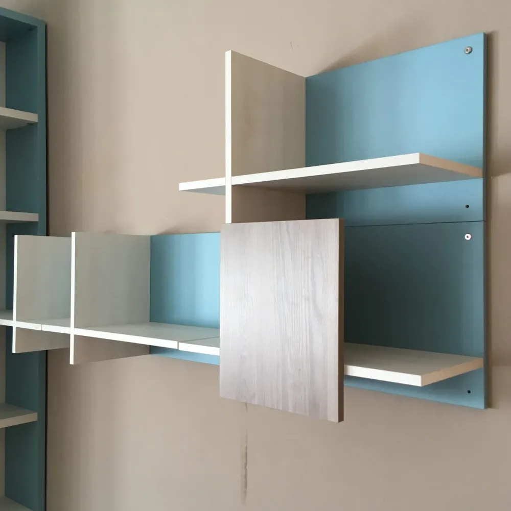 Cameretta Mistral nelle finiture Laminato Materico color Olmo Sbiancato, Cenere e Azzurro Cielo, composto da armadio battente da 90+90 cm, con nr. 03 cassettoni inferiori,e fianco a spalla libreria. Scrittoio con piano nelle finiture Olmo Cenere e gambe di sostegno in metallo verniciato color Bianco, supportate da una sedia girevole nelle colorazioni in Bianco con seduta imbottita in tessuto color Grigio Chiaro. Superiormente lo scrittoio è supportato da una composizione “appesa” e “aperta” nelle medesime finiture Olmo Sbiancato, Cenere e Azzurro Cielo. Il letto da una piazza e mezza per materasso e rete (non inclusi) da L 120×195 cm circa nelle stesse finiture e colori Olmo Cenere e Azzurro Cielo, con comodino da L 60 cm con due cassetti, mentre alla dx del letto si colloca una libreria da H 190 cm circa per L 100 cm, nelle stesse finiture come sopra Olmo Sbiancato con frontali Azzurro Cielo.