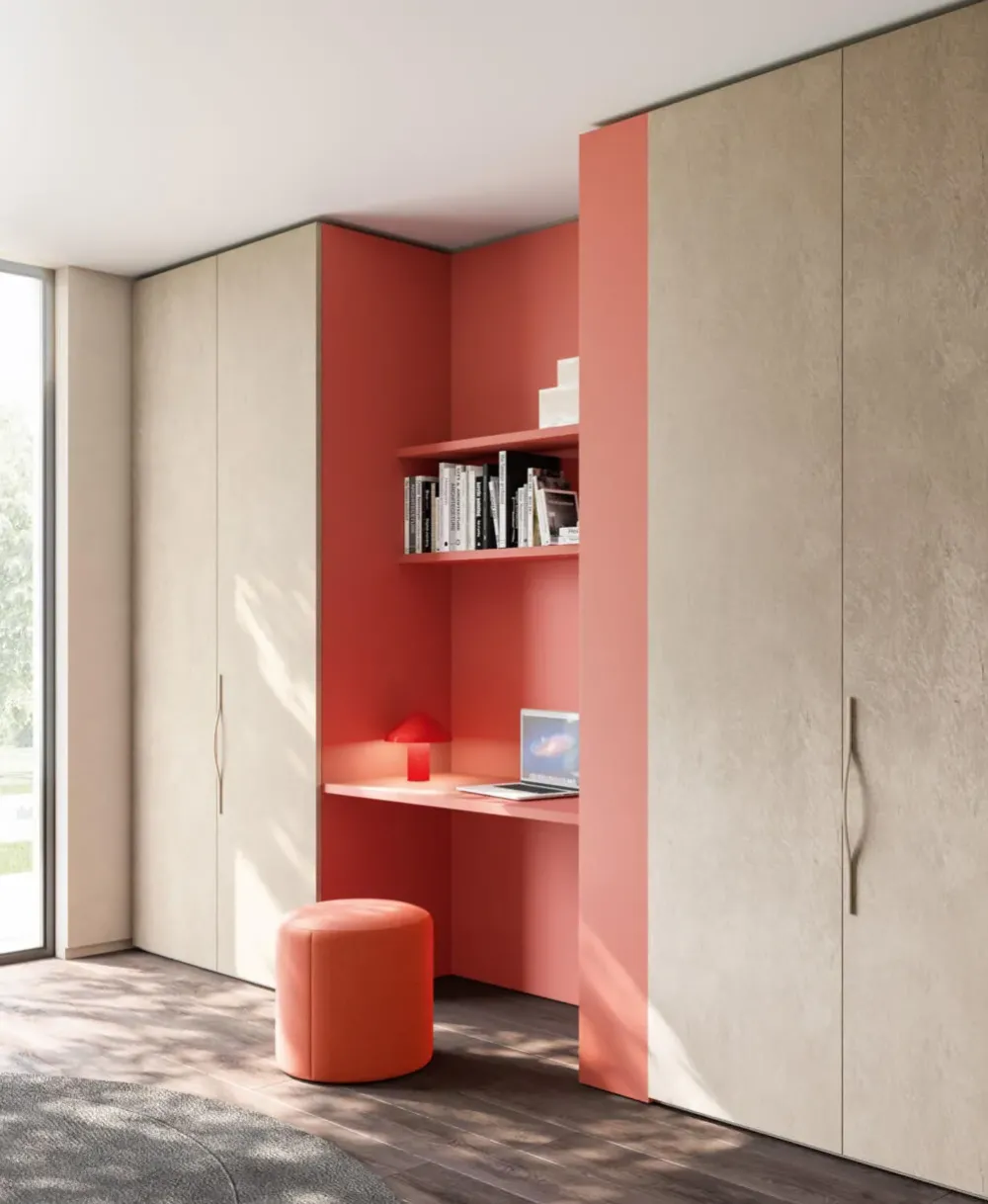 Armadio battente con anta liscia in finitura Dekor Avana con elemento libreria e scrittoio spessore cm 3 in finitura Corallo. Maniglia T53.
