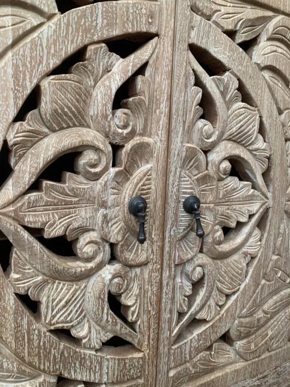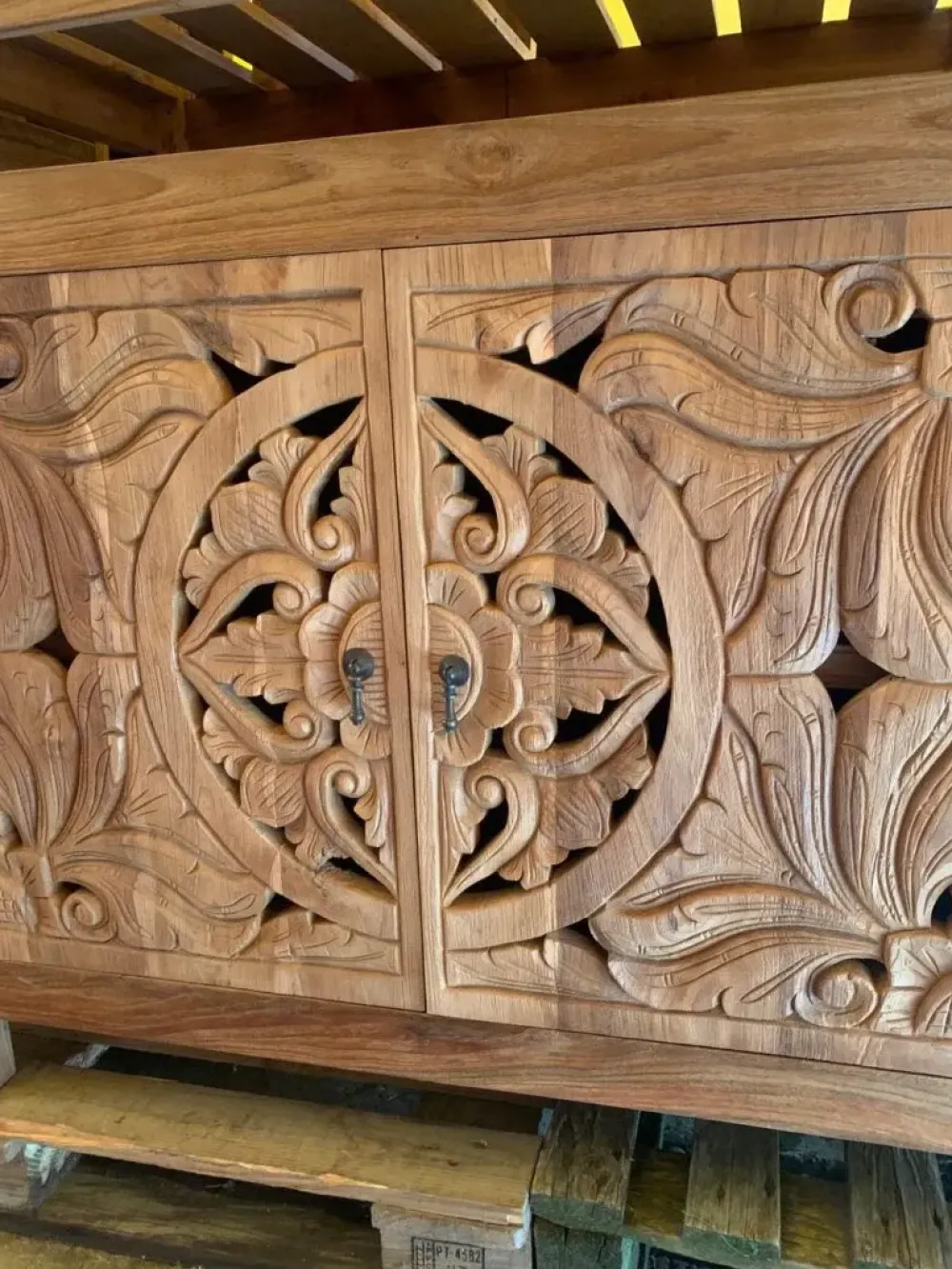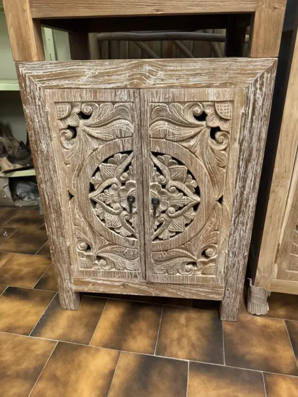 Mobile Oriente Teak , Mobile indonesiano realizzato artigianalmente con Teak massello finitura leggermente sbiancata oppure naturale teak. Se vuoi un pezzo veramente particolare per arredare i tuoi ambienti l hai trovato. Le decorazione sulle ante sono intagliate finemente a mano con motivi floreali. Pezzo originale che saprà dare carattere alla zona giorno.