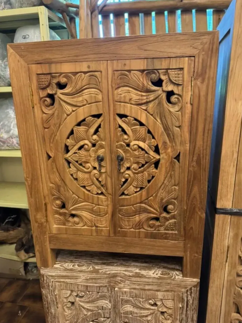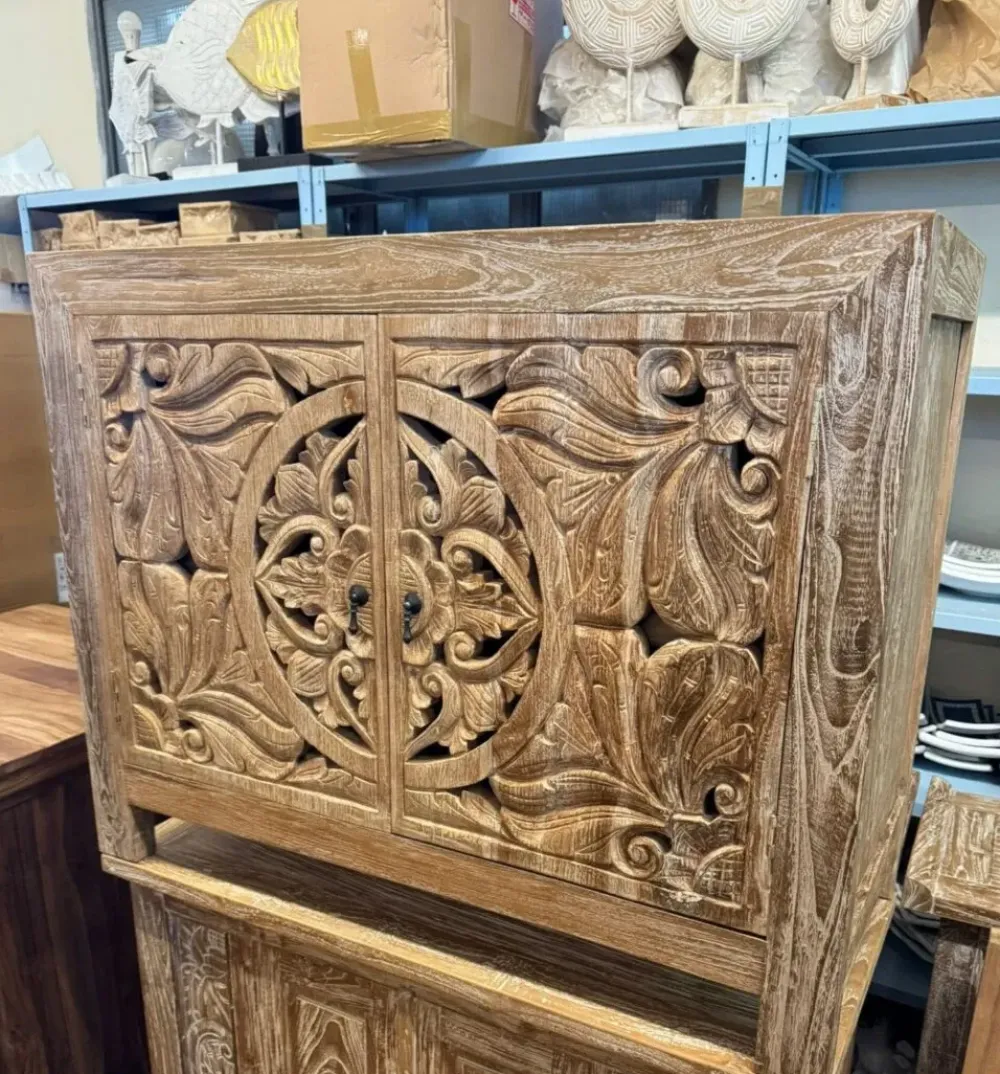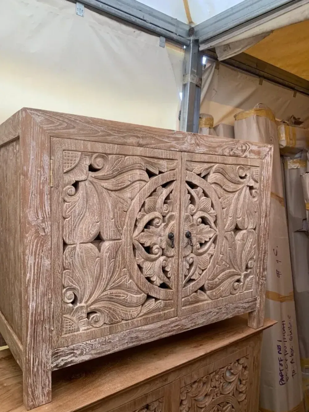 Mobile Oriente Teak , Mobile indonesiano realizzato artigianalmente con Teak massello finitura leggermente sbiancata oppure naturale teak. Se vuoi un pezzo veramente particolare per arredare i tuoi ambienti l hai trovato. Le decorazione sulle ante sono intagliate finemente a mano con motivi floreali. Pezzo originale che saprà dare carattere alla zona giorno.