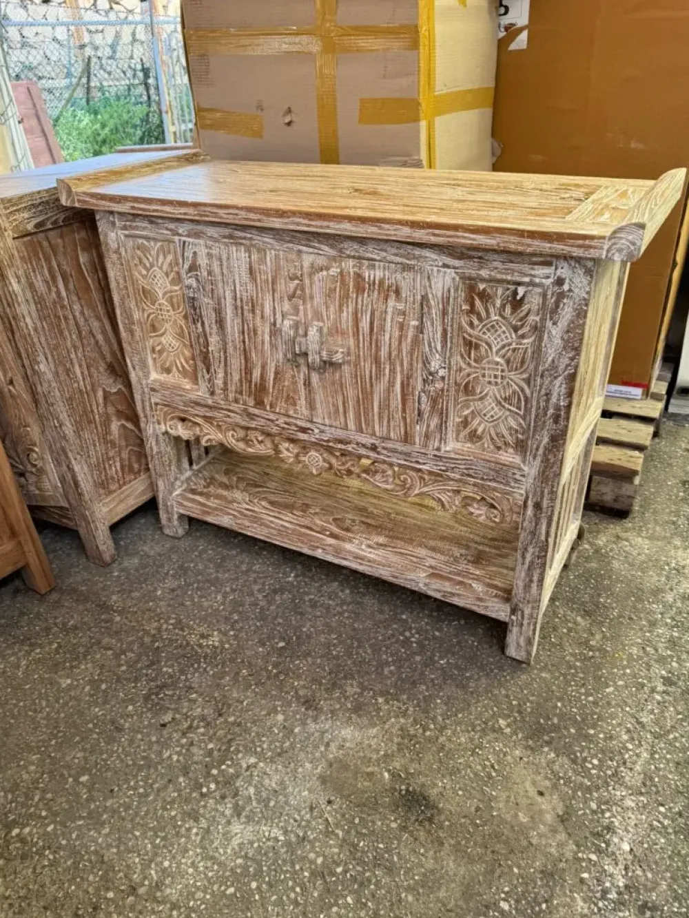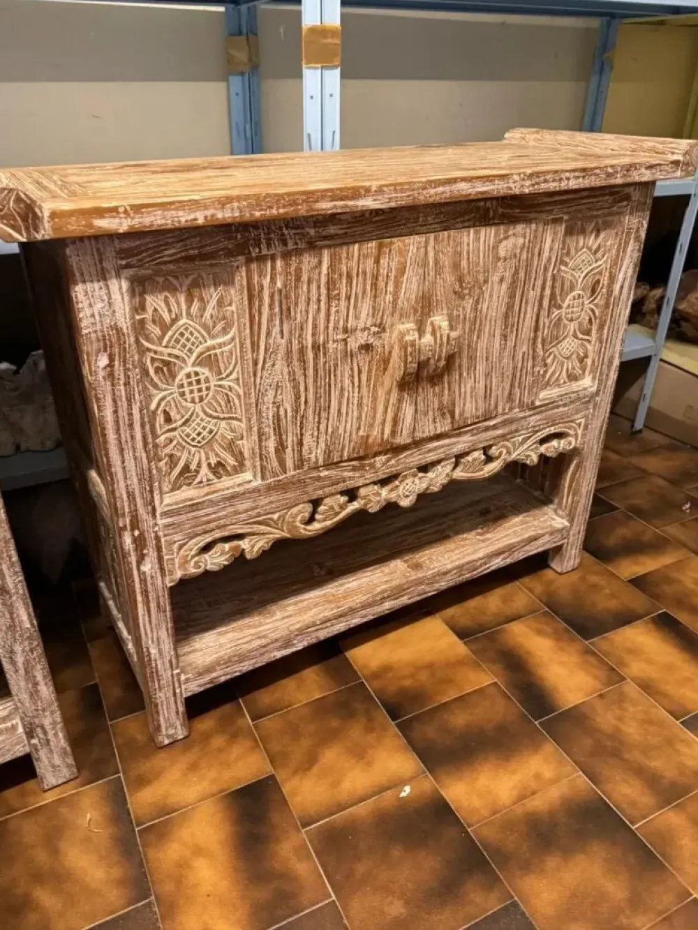 Mobile Consolle Bagno Teak Decapato , Mobile etnico orientale realizzato artigianalmente in Teak massello riciclato e intagliato a mano con motivi floreali.