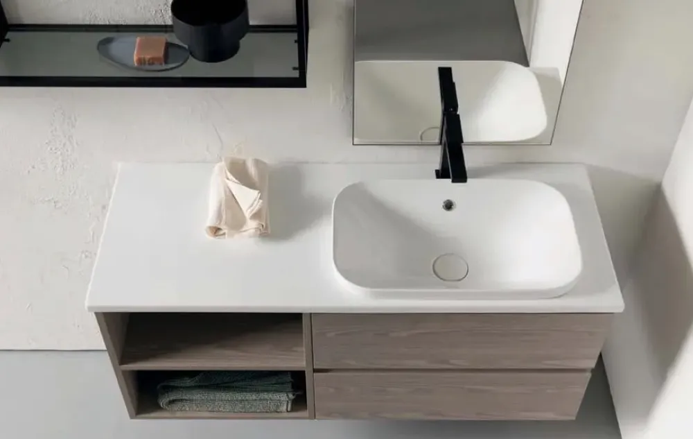 - Con il fine di poter far fronte a diverse problematiche abitative, il brand ha messo a punto una serie di arredi di varie tipologie per il bagno; il modello presente in foto è un mobile sospeso, plurifunzionale e ampio.