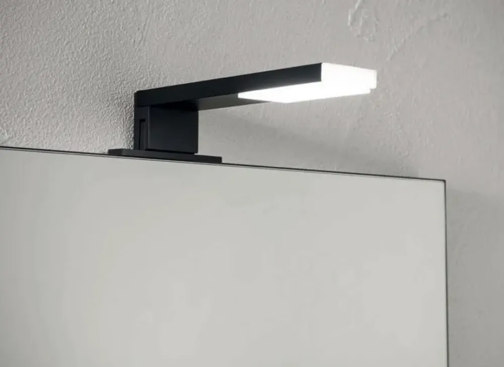 Specchiera mod. KUBIKA illuminata da faretto mod. ZIKO posizionato nella parte superiore.