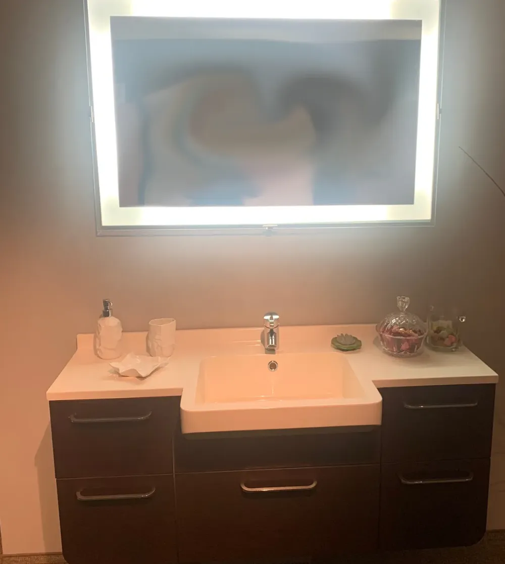 Acquista ora un Arredo bagno Novello di Materiale legno con Stile design e Tipologia sospeso. Include un lavello integrato, uno specchio grande e di classe, ma non include nessun rubinetto. Trasporto escluso.