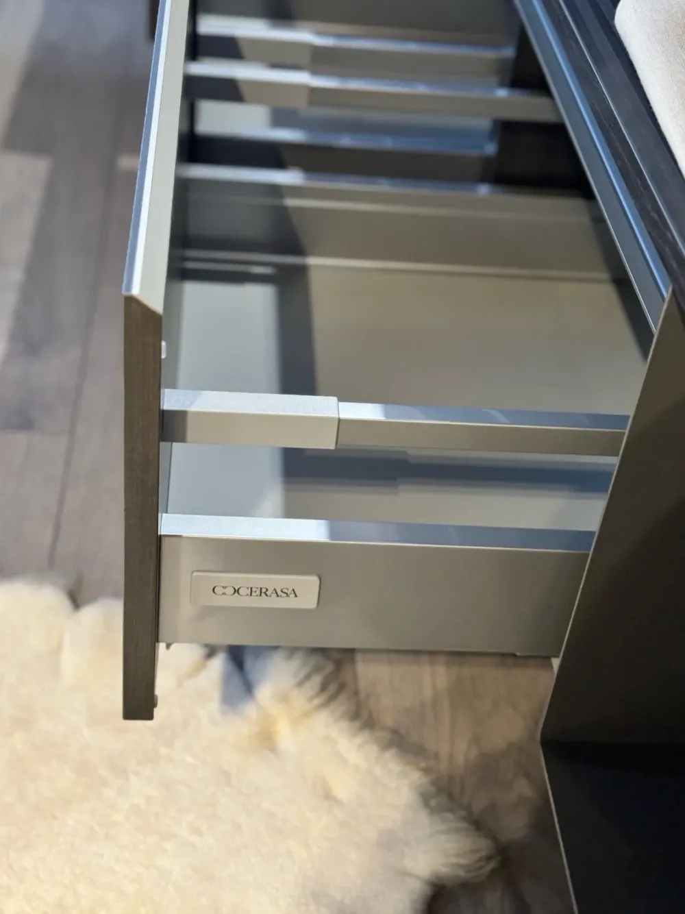 Con il fine di poter risolvere svariate esigenze abitative, il marchio ha ideato una serie di mobili di differenti tipologie per la stanza da bagno; il modello visibile in foto è un mobile sospeso, plurifunzionale e spazioso.