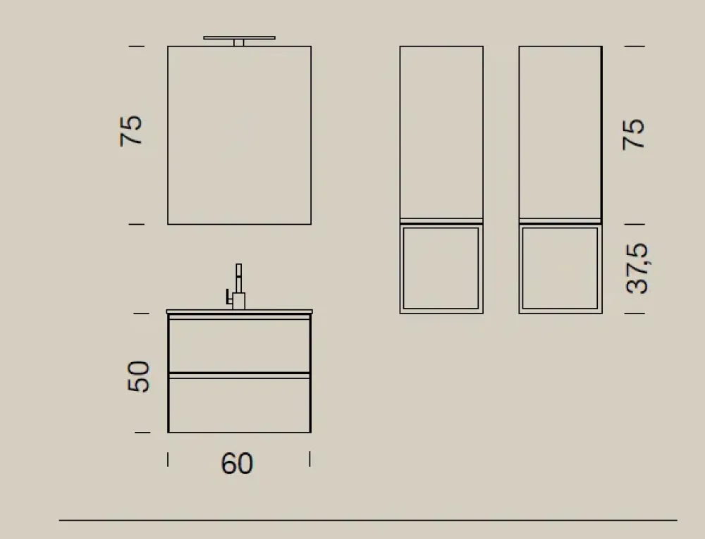 La base portalavabo, oltre alla misura base di 60 cm, è prevista anche nelle seguenti misure: 85 cm, 95 cm, 120 cm (per conoscere i relativi prezzi contattateci).