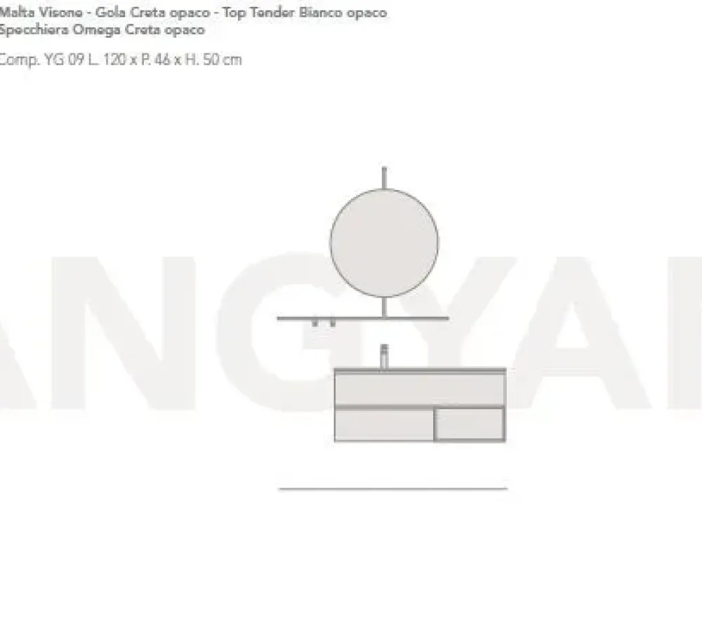 nel design della specchiera Omega. Top mod. Tender in Mineral Tech Bianco opaco. Ha una larghezza di 120cm, profondità di 45cm e altezza di 50cm. Articolo su ordinazione tempi per la fornitura 40 – 50 giorni con finiture dei materiali personalizzabili su richiesta tra quelle esposte nelle immagini senza variazione del prezzo. Consegna compresa in tutto il territorio nazionale. La nostra offerta per la composizione Yang 9 è di euro 2.200,00. Per maggiori informazioni e preventivi contattaci via mail.