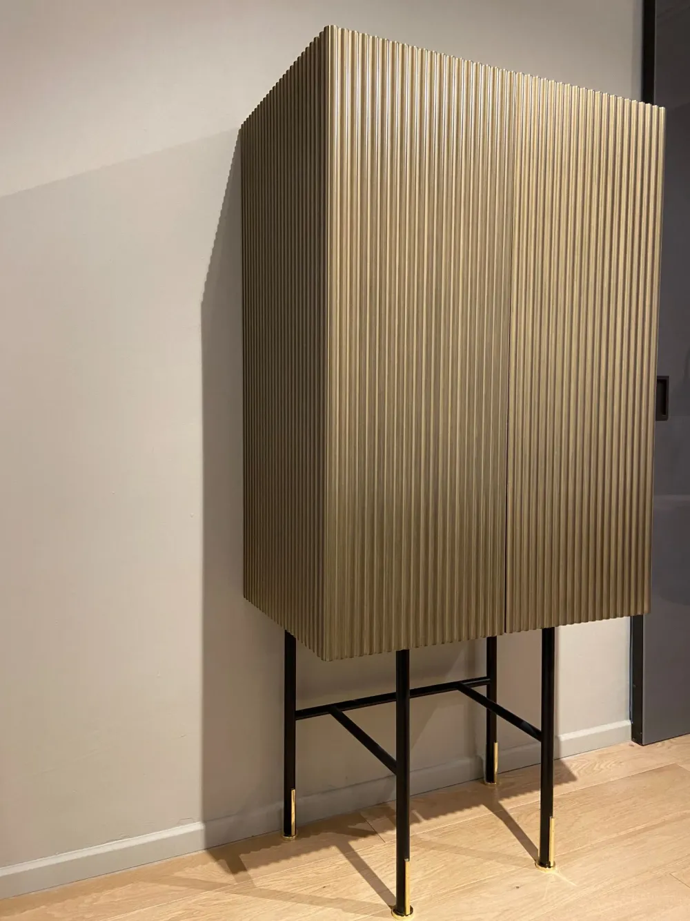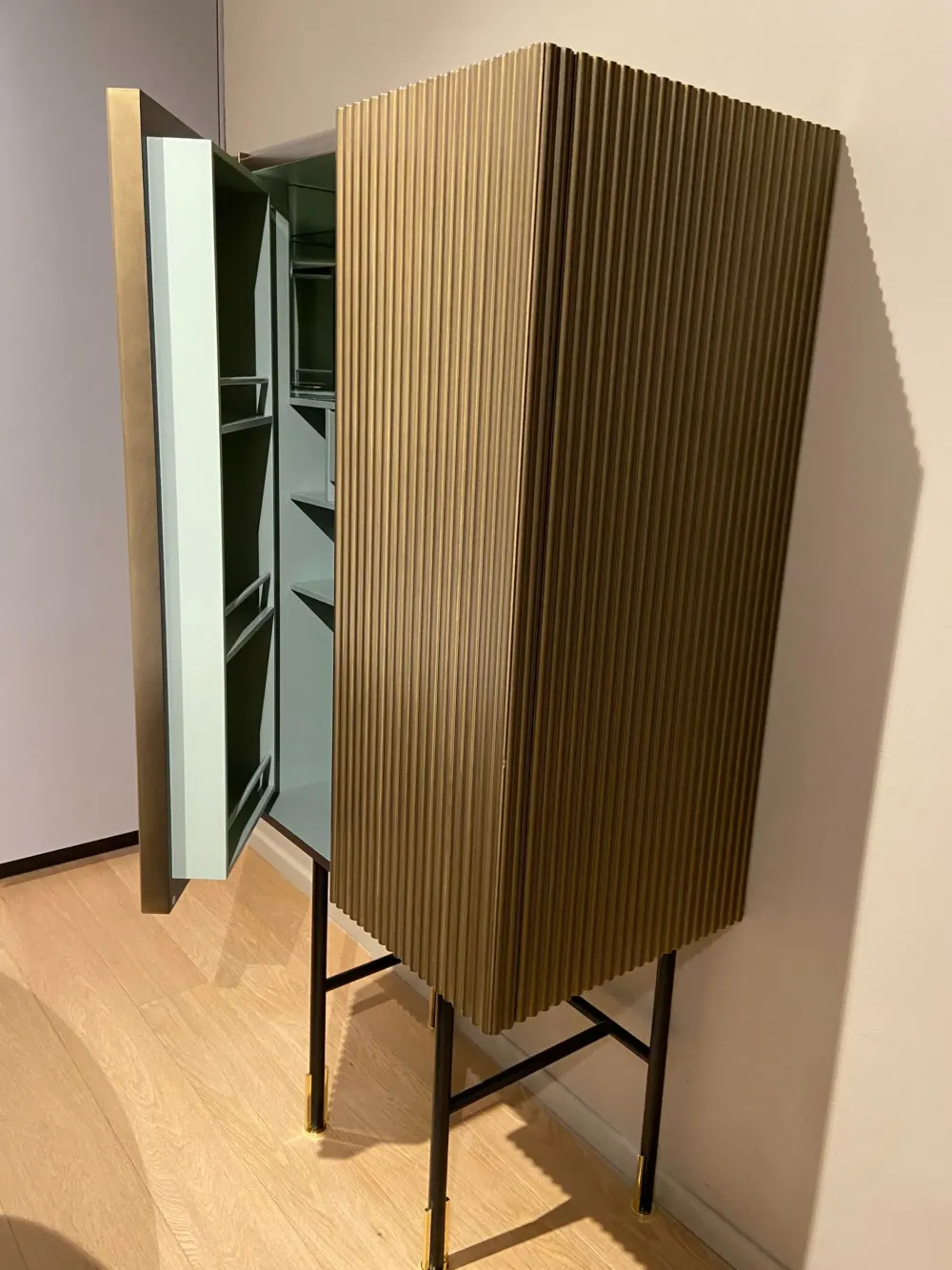 Aero è un elegantissimo mobile bar a due ante con finitura ottone vintage ed interni salvia. I colori e la trama verticale rendono questa elegantissima madia una reinterpretazione in chiave moderna dei mobili bar anni ’30. La struttura interna è pratica e contenitiva e permette di posizionare con grande agio bottiglie, vassoi e bicchiere di qualsiasi dimensione. Un articolo perfetto per stupire, con eleganza e praticità, i vostri ospiti. dimensioni: Larghezza 73 cm – altezza 152 cm – profondità 45,5 cm