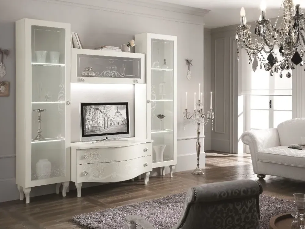 Per arricchire un soggiorno classico opta per una parete attrezzata che mantenga una certa idea di stile, come questo modello Composizione 24 a prezzo ribassato.