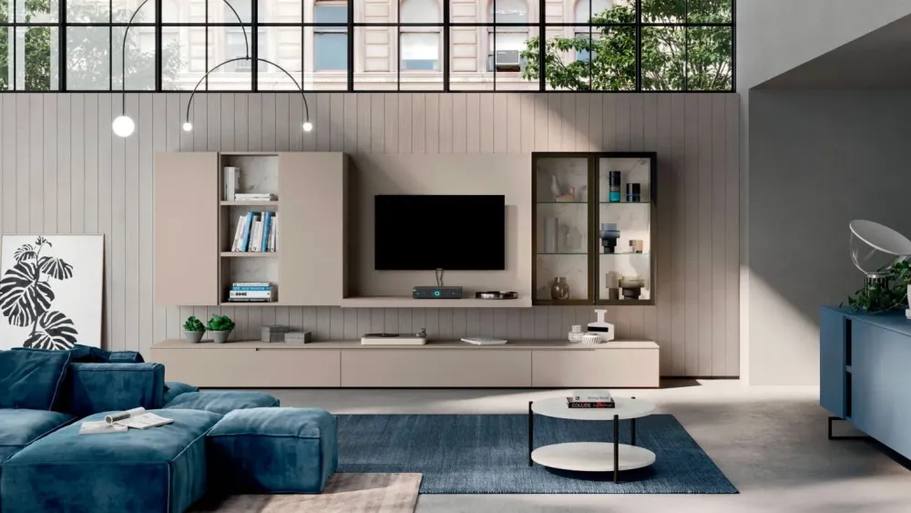 - La composizione per il living qui visibile è realizzata in materiali pregiati e resistenti nel tempo: questo modello, in particolare, è in laccato opaco.