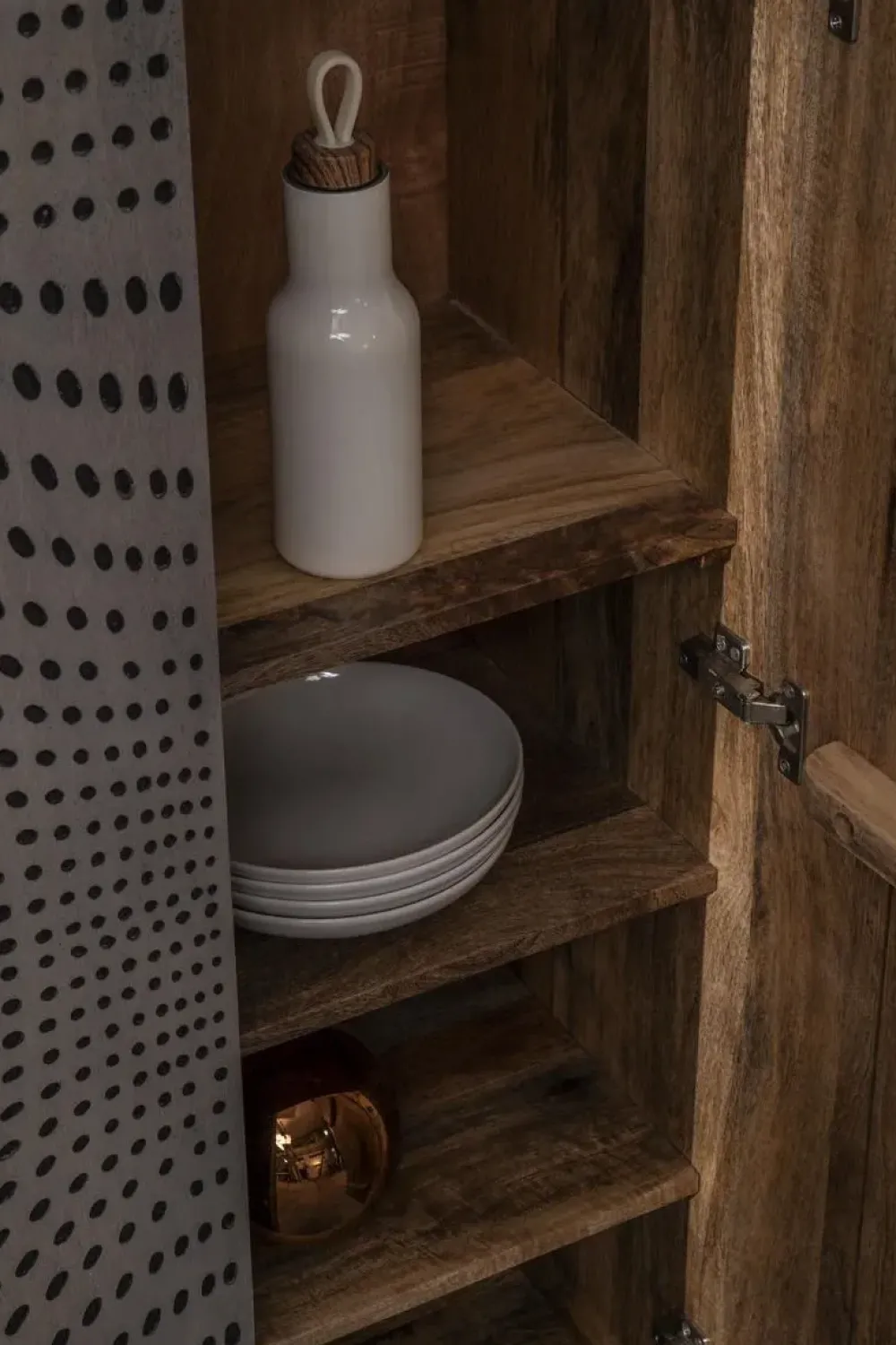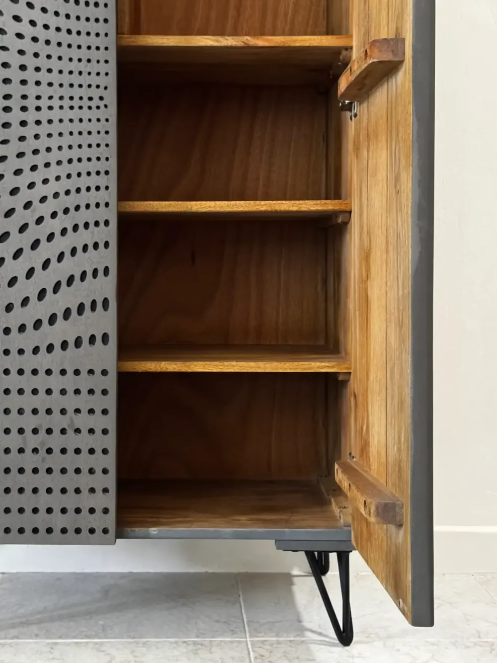 Credenza Ela in legno di mango massello su piedini in metallo in finitura è di colore grigio con una particolare lavorazione che riproduce un elegante effetto ottico.