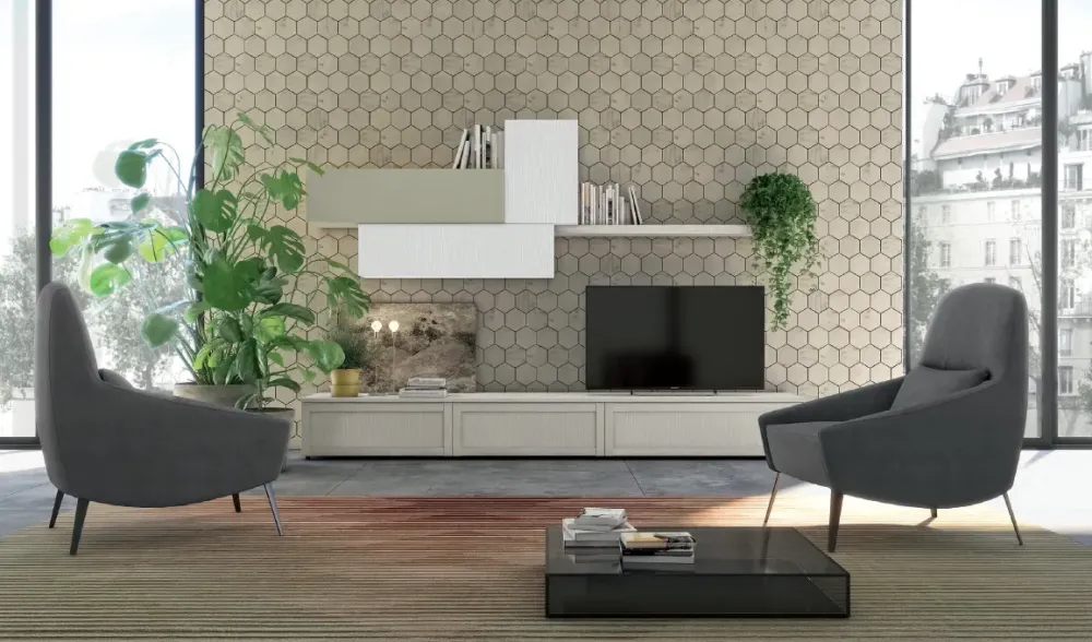 - Questa composizione per il soggiorno sarà la scelta ideale se desideri una parete attrezzata push–pull dalle forme decise.