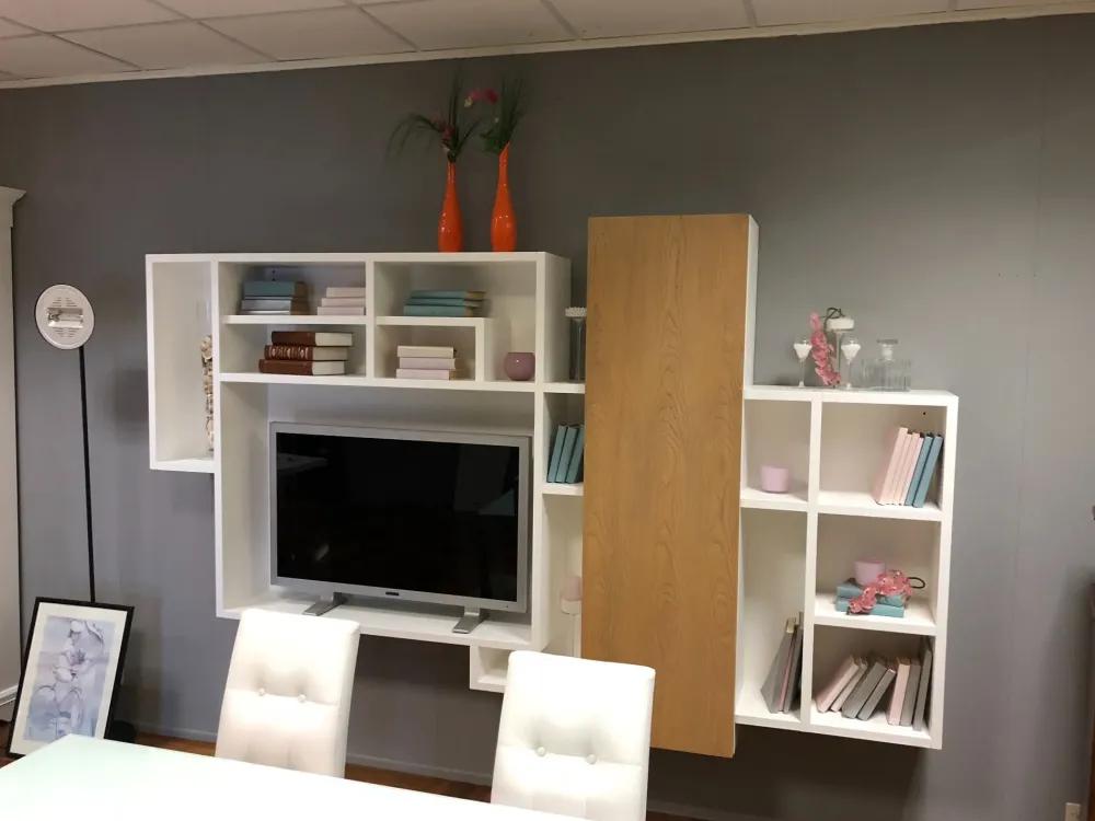 Parete attrezzata di design in legno listellare di rovere , laccata bianca con anta rovere naturale ,PRODOTTO DA ESPOSIZIONE L 270 cm H 170 cm P 33/35,5