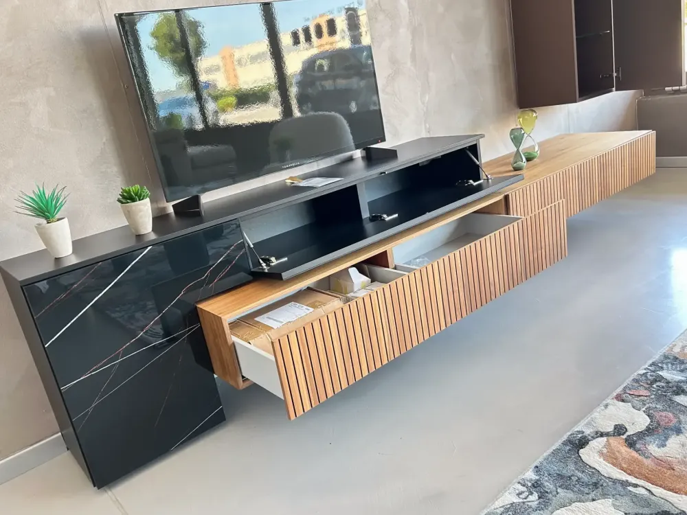 Per completare un living moderne scegli una parete attrezzata che mantenga una certa coerenza di stile, come questo modello Parete tv a prezzo ribassato.