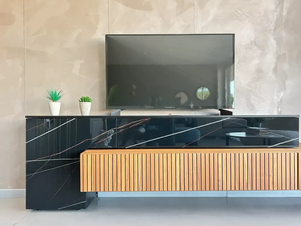 Questa parete TV si distingue per il suo design moderno e ben bilanciato, dove linee pulite e finiture ricercate si combinano per creare un atmosfera elegante e funzionale. La composizione alterna moduli sospesi a una solida base a terra, offrendo così un mix di leggerezza visiva e stabilità. Perfetta per valorizzare la zona living con ordine e stile, è arricchita da un dettaglio che ne esalta il carattere e l esclusività.