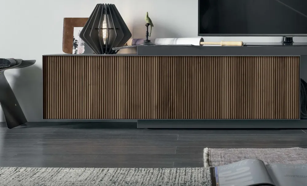 Per impreziosire un soggiorno design prediligi una parete attrezzata che mantenga una certa coerenza stilistica, come questo modello S002 a prezzo ribassato.