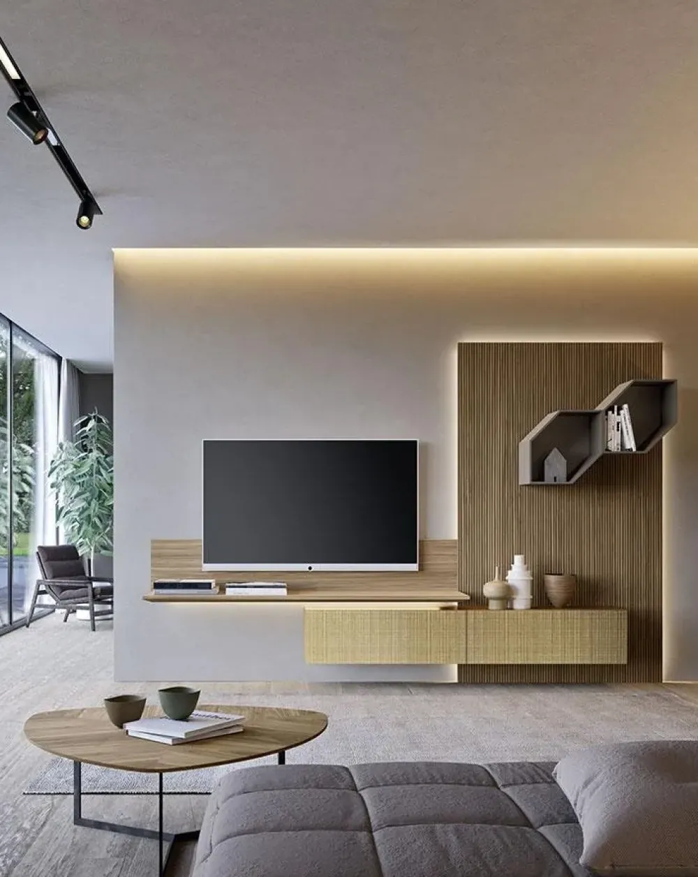 Questa composizione per il soggiorno si dimostrerà la scelta ideale se desideri una parete attrezzata senza maniglia dalle linee decise.