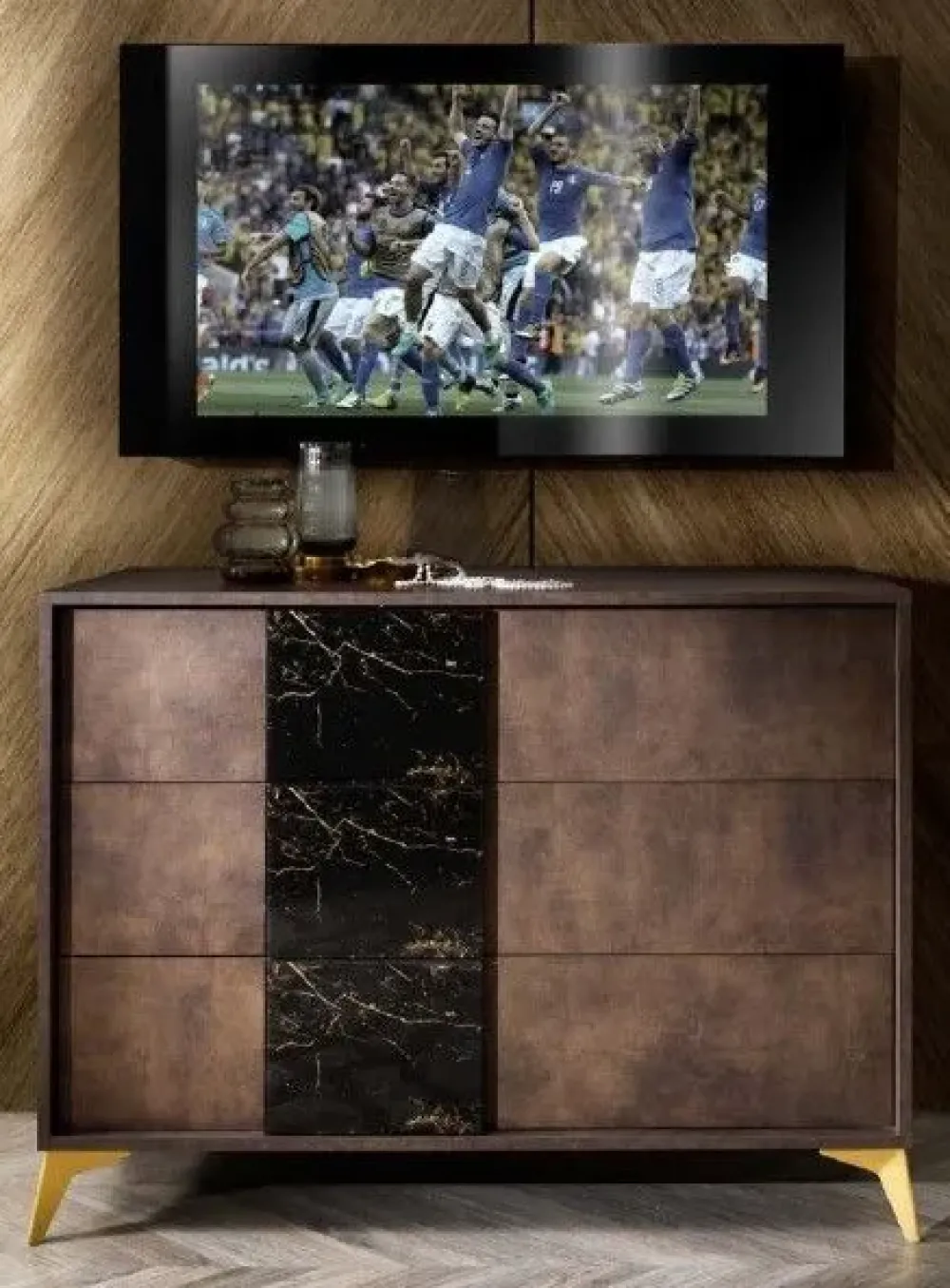 – COMO’ CON MANIGLIA VETRO EFFETTO MARMO E PIEDINI IN METALLO ORO