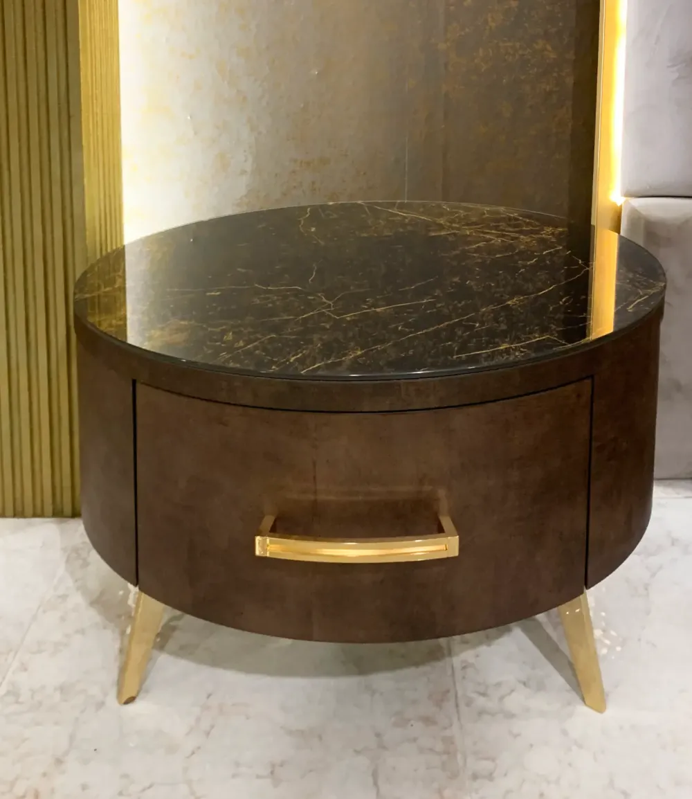 Trittico finitura effetto pelle primo fiore con maniglie e piedi in metallo bagnati in oro e piano in vetro effetto marmo