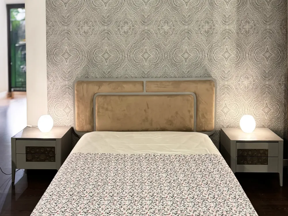 LETTO HONEY con testiera imbottita in econabuk effetto velluto e giroletto in legno.