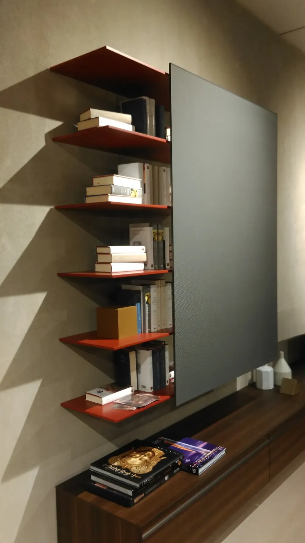 La libreria pensile Password di Molteni&C, con anta scorrevole in vetro rigato 3D colore antracite, ha i ripiani rosso rubino e la spalla interna a specchio. Si accede frontalmente alla libreria da entrambi i lati. Può essere caricata per un massimo di 75 kg, uniformemente distribuiti. Dimensioni: larghezza 110 cm – altezza 154,2 cm – profondità 36,2 cm. La libreria necessita di uno spazio complessivo in larghezza di 190,2 cm. la proposta non include il mobile sotto la libreria pensile.