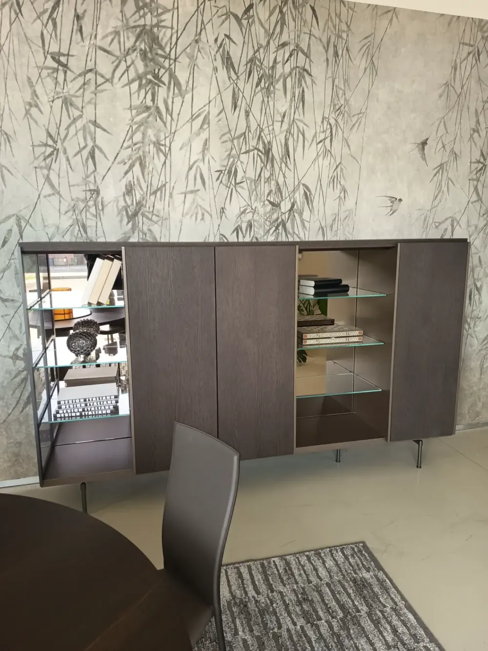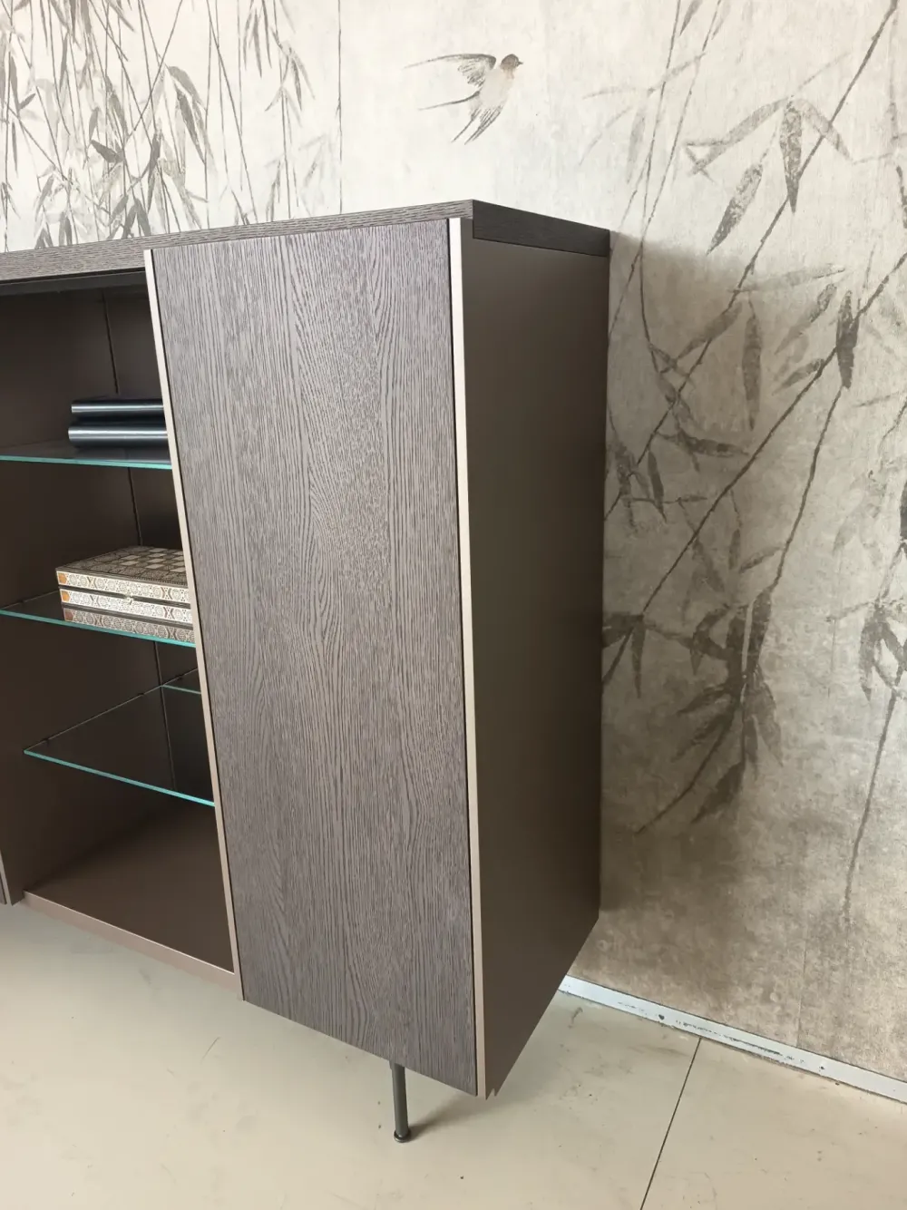 Composizione soggiorno Molteni modello Logos in rovere caffè e particolari laccato colori Cappuccino, elemento terminale a giorno con spalla in vetro, alcuni schienali sono in vetro bronzo completo di illuminazione a led. Basamento con piedini in colorazione Peltro.