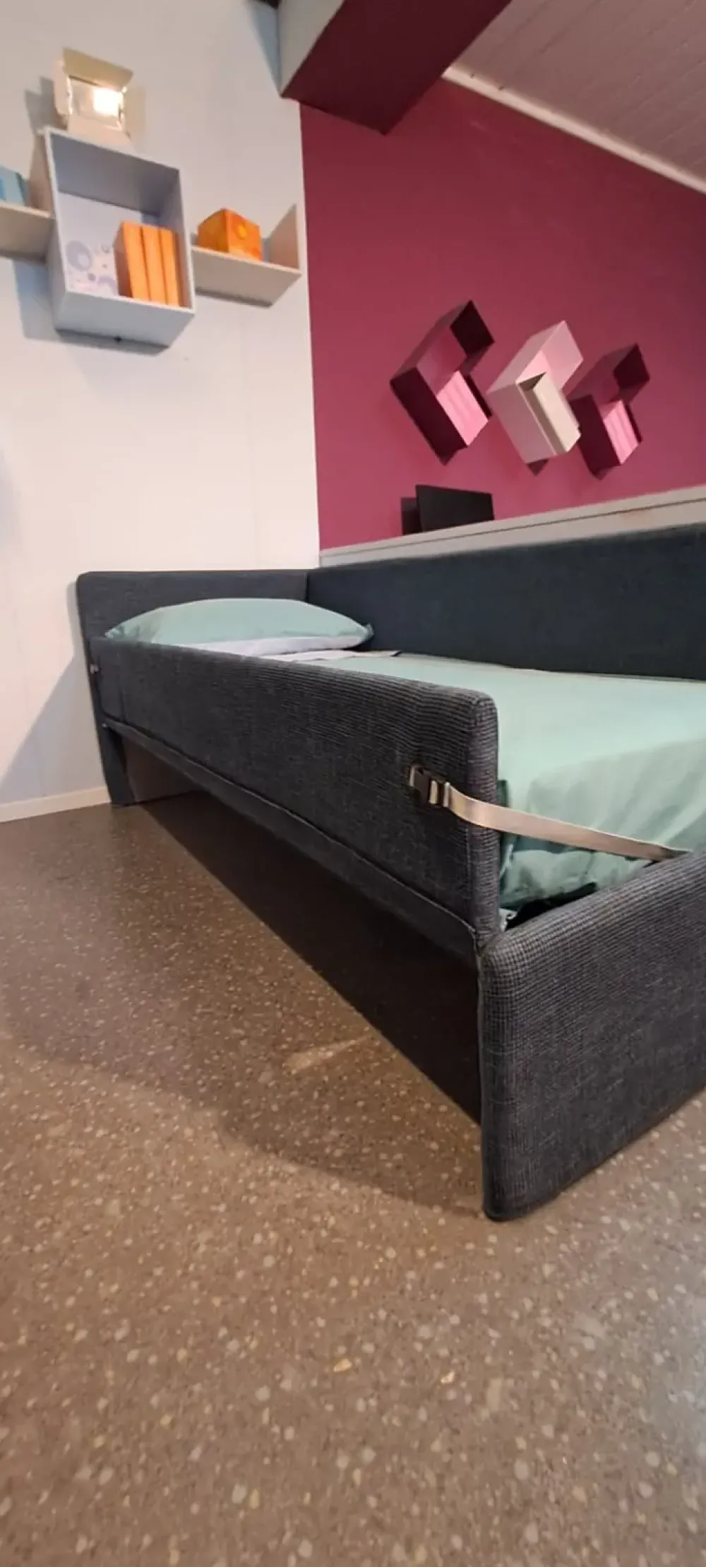 Letto dormeuse con rivestimento in tessuto sfoderabile, pratico fascione ribaltabile con blocco che funge da protezione laterale.
