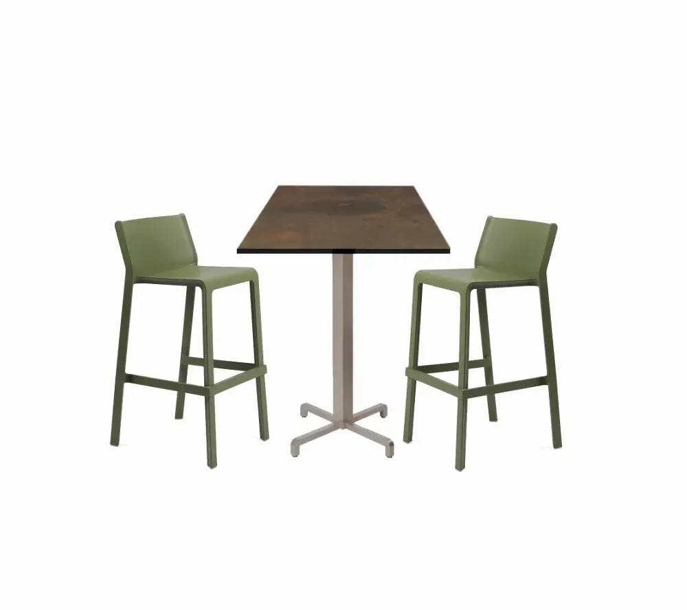 Tavolo high 70×70 cm piano HPL Corten con due sgabelli Trill verde agave- Nardi