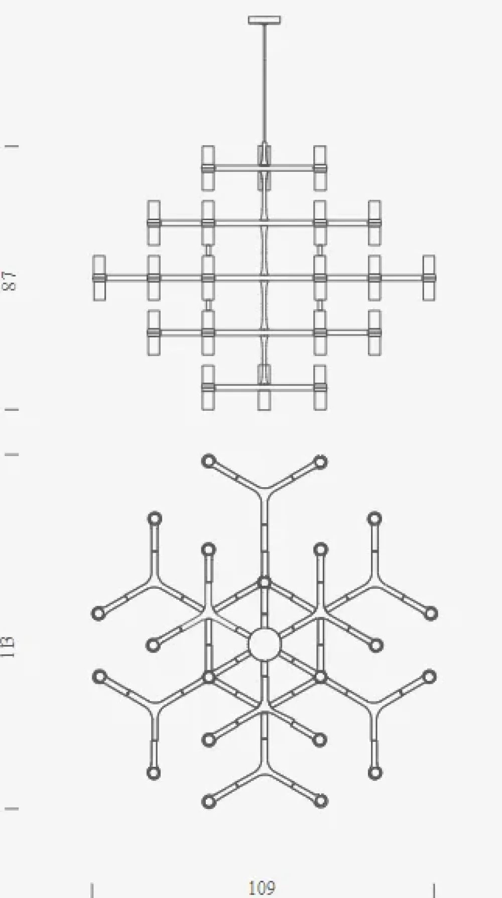 Famiglia di chandelier a sospensione la cui forma si ispira alla sagoma del cristallo di neve.