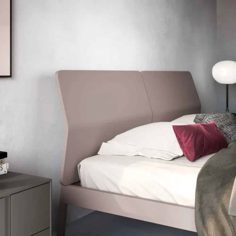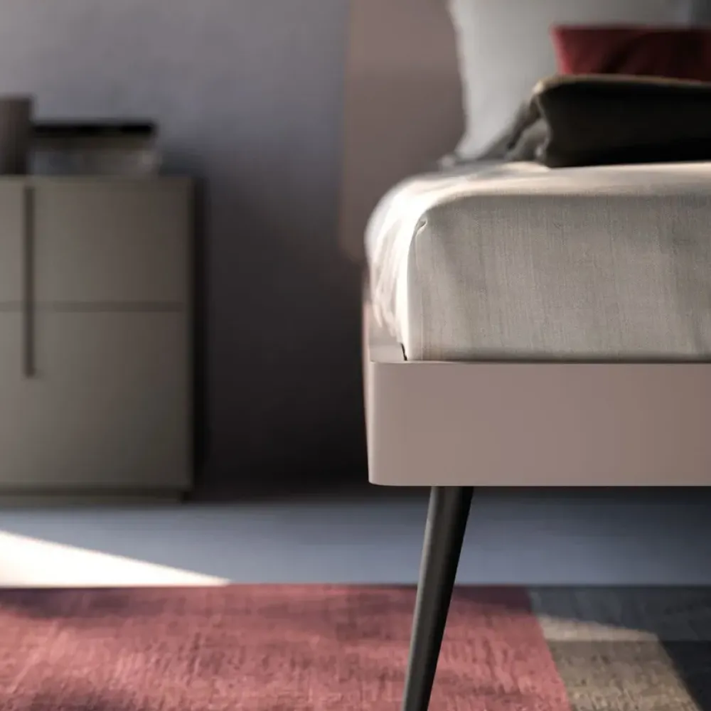 Letto Ofelia con giroletto Gamma in laccato opaco Ortensia e piede Metal 1 in metallo brunito.