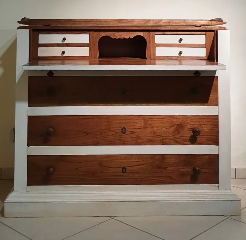 Gruppo comò e comodini di dimensioni generose, le dimensioni del cassettone sono L.131 x p. 57/72 x h. 105 cm mentre quelle dei comodini sono L. 60 x p. 40 x h. 70 cm. il gruppo è caratterizzato da una doppia finitura sia in noce che in un laccato avorio patinato a mano ed entrambi rifiniti a cera. Le dimensioni permettono un ottimo contenimento sia nel cassettone che nei comodini; il cassettone è caratterizzato da un’ampia ribalta nella parte superiore, ribalta caratterizzata da 4 cassetti e un’ansa centrale, i comodini hanno come particolarità la disponibilità di un vano chiuso ad anta ed esiste il comodino con anta destra e quello con anta sinistra, oltre allo sportello hanno anche un comodo cassetto.