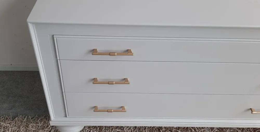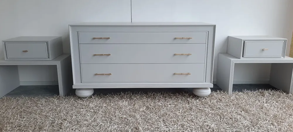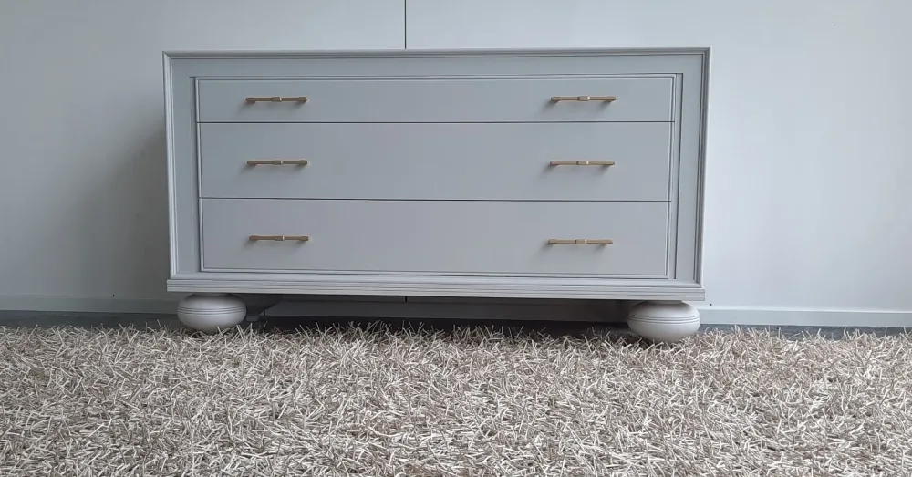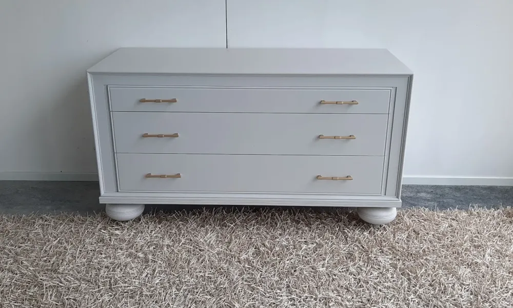 Comò a 3 cassetti completamente in legno , con finitura laccata color cenere opaco , impreziosito da maniglie color oro satinato , zoccolo a cipolla in legno massiccio Misure 134x56x74h POSSIBILITA’ DI AVERLO IN ALTRI COLORI (VEDI SCHEDA ALLEGATA) TRASPORTO IN TUTTA ITALIA INCLUSO NEL PREZZO (ISOLE CON SUPPLEMENTO)