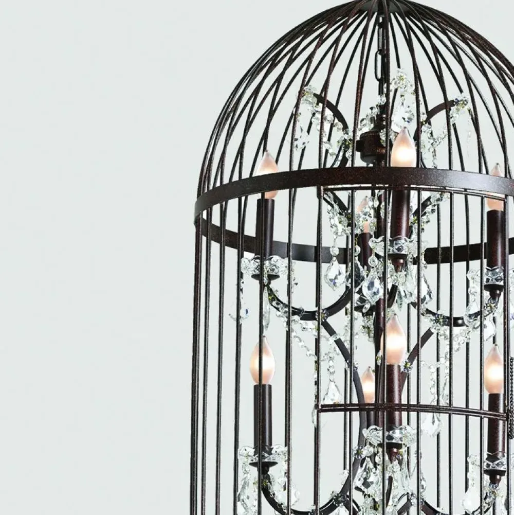 Lampadario 8 punti luce, in metallo finitura ferro arrugginito con pendenti in cristallo.