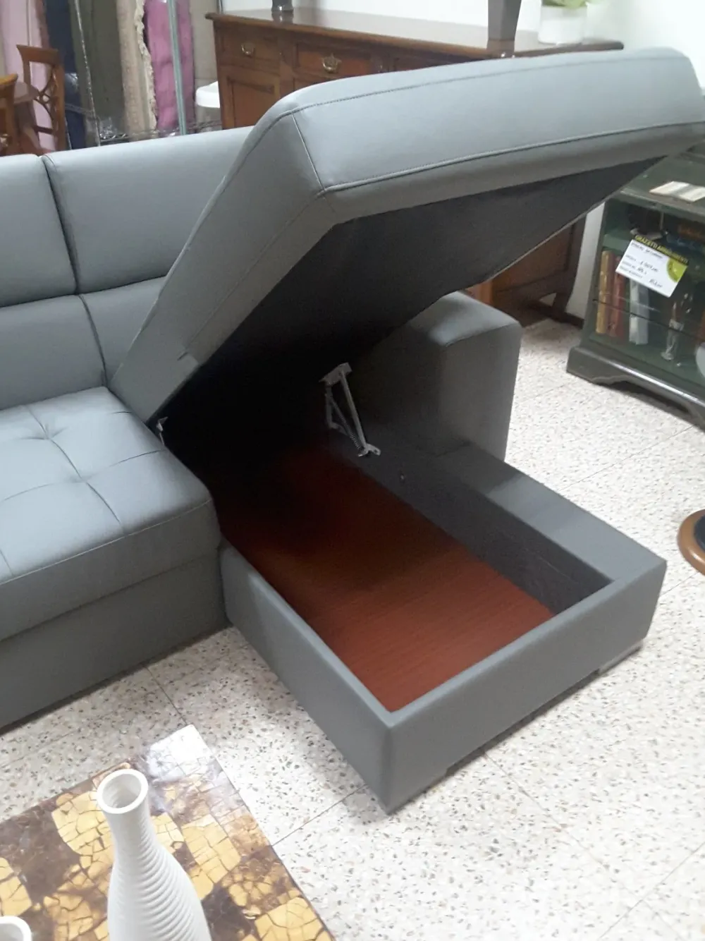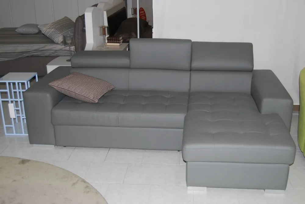 Divano con schienale reclinabile nella parte alta per facilitare il comodo appoggio della testa di chi si siede. Composizione da cm 240 x 160. Rivestito in ecopelle GRIGIO non sfoderabile. Completamente trasformabile, penisola alzabile con contenitore sotto, e parte sotto il divano lungo apribile in avanti con letto estraibile per formare un piano unico. Il prezzo non comprende il trasporto, preferito ritiro diretto. 2 Colli tot.mc 2,70, Ultima composizione disponibile.